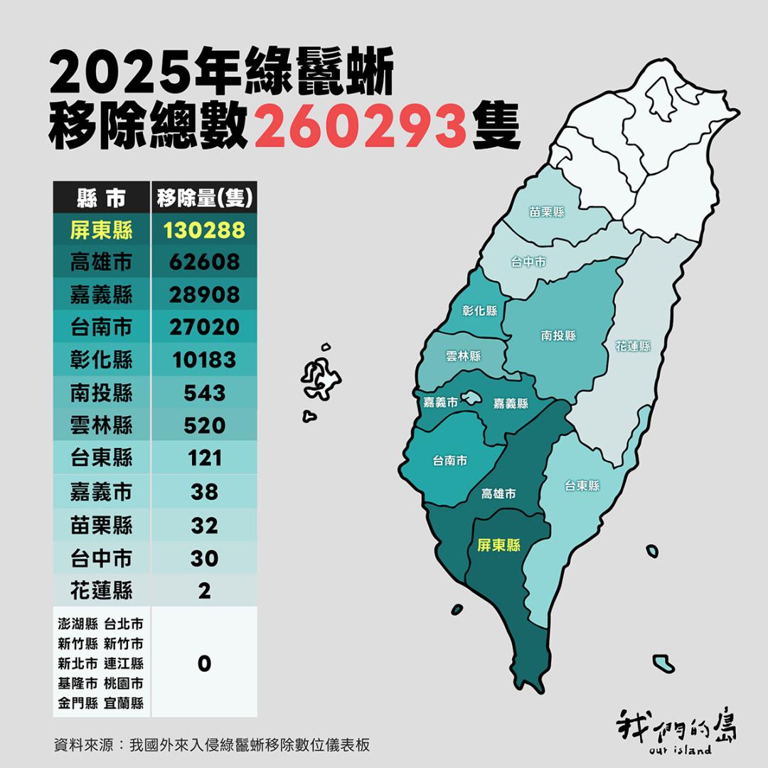 2025年綠鬣蜥移除總數。資料來源:我國外來入侵綠鬣蜥移除數位儀表板、我們的島製圖
