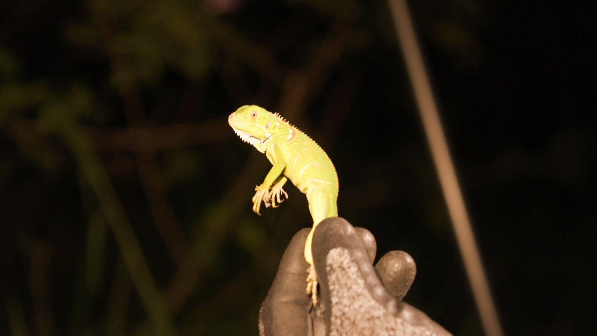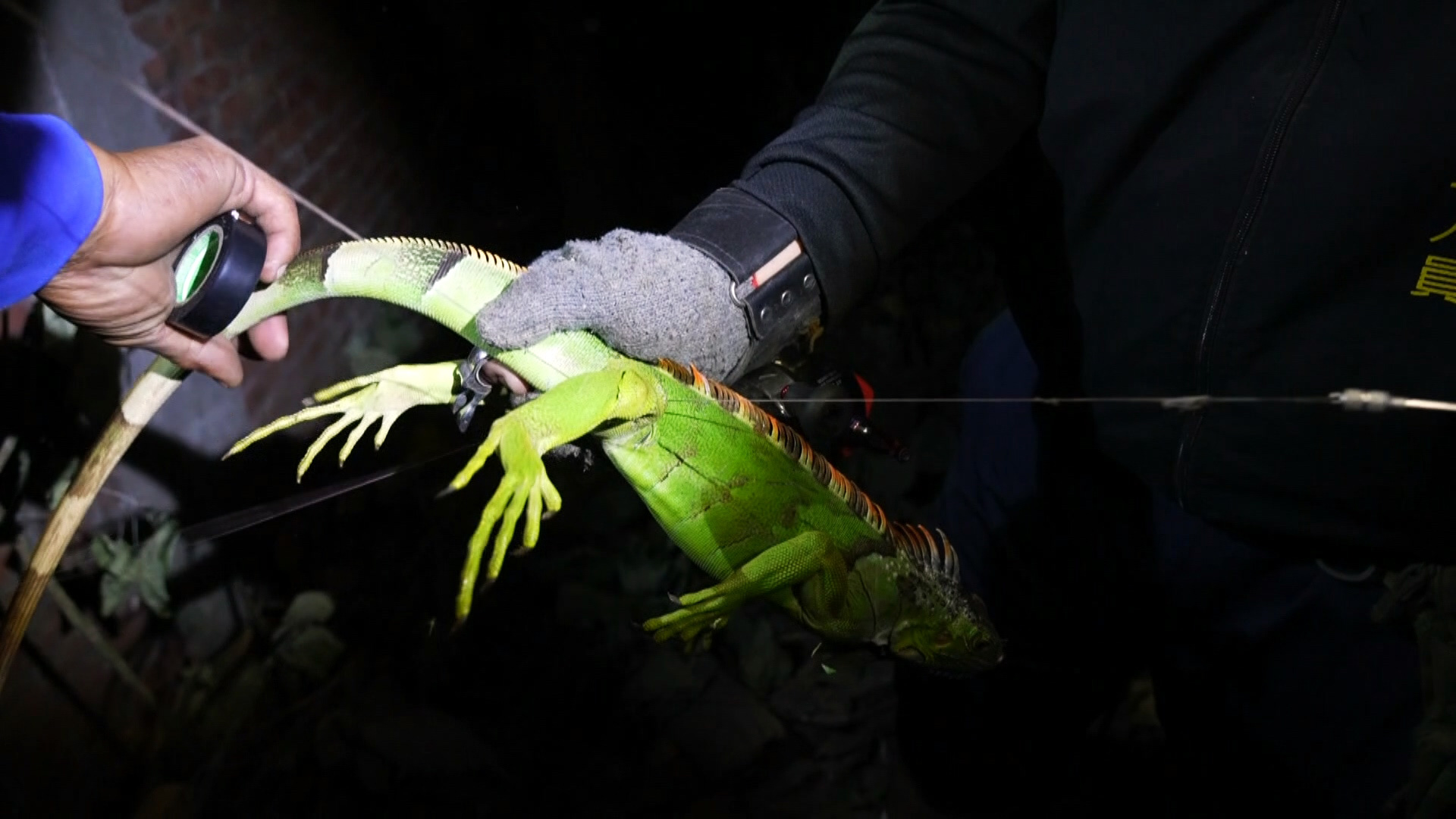 另外,綠鬣蜥危害嚴重的地方政府,也委託專業廠商進行移除,受屏東縣政府委託的移除廠商成員吳承樺表示,綠鬣蜥在夜間行動力下降,相對容易移除,他們使用「彈弓魚標」牽線射擊,能循線將綠鬣蜥拉回來。