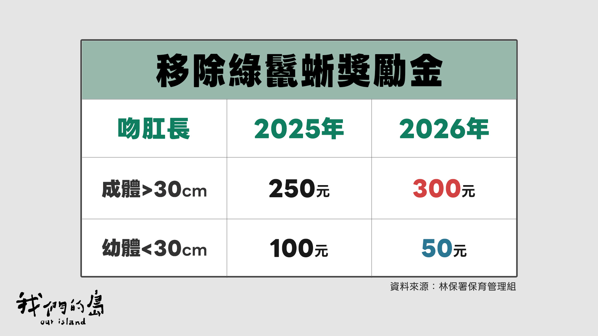 因此,林保署決定調整2026年的獎勵金額,將量能放在刀口上,鼓勵優先移除具繁殖力的成體, 林保署保育管理組副組長黃綉娟說明,完訓民眾捕獲成蜥的獎勵金從250元提高到300元;幼蜥從100元調降為50元。委託廠商的部分,成蜥酬勞維持500元;幼蜥從200元調降為100元。