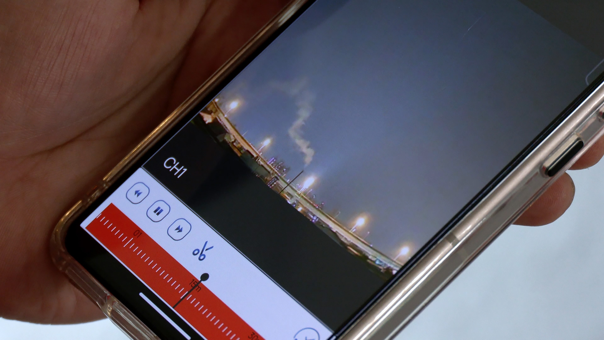居民張先生用手機觀察煙囪風向與煙霧狀況,在排放期間盡量避開。
