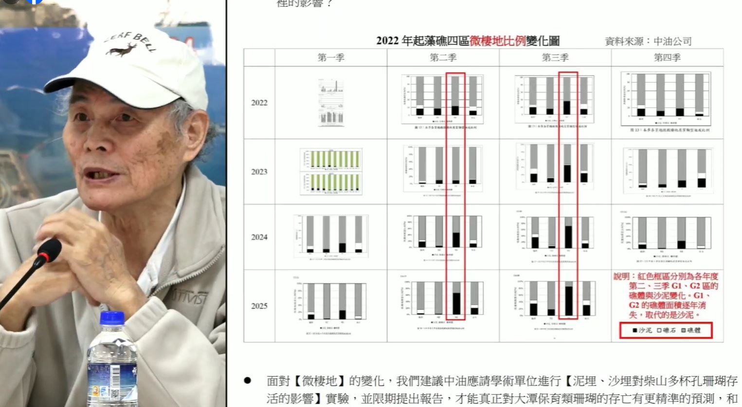 對於G1區的積沙現象,潘忠政從中油提供的資料,整理出微棲地比例變化圖,指出從2022-2025年的第二季和第三季,可明顯看出沙埋也就是積沙的現象,越來越嚴重,希望海大能找出真正原因,無法接受只用大自然現象的說法來解釋,而規避三接工程造成的影響。