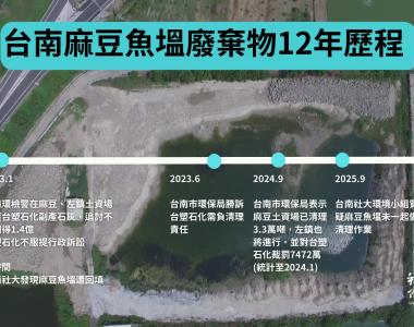 台南社大環境小組黃煥彰老師,播放過去影像資料,指出2013年台塑在麻豆魚塭,填埋大量不合法石灰。整整12年,法院已經判定副產石灰不該填埋農地,但是至今仍未清除。(延伸閱讀:再利用的真與假-魚塭養出廢棄物)