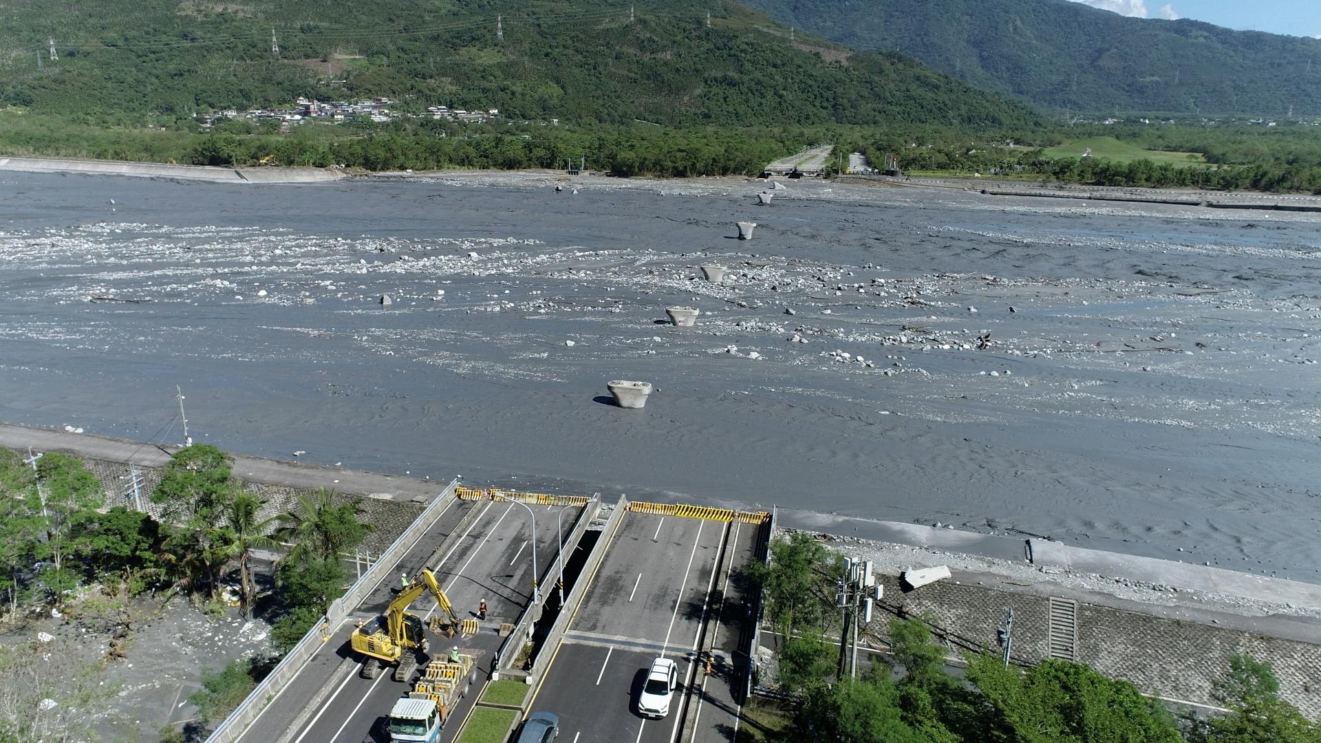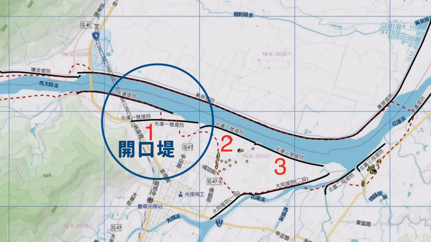馬太鞍溪南岸堤防之所以會有缺口,是因為它當初就設計成「開口堤」,這種設計的用意之一,是創造暫時性的滯洪空間,退水時積水可以從開口迅速排除,但堰塞湖潰決的水量過於龐大,可能會從缺口湧入,因此水利署第九河川分署,八月就開始進行開口堤封堵、河道疏浚、既有堤防的非破壞性檢測等作業。
