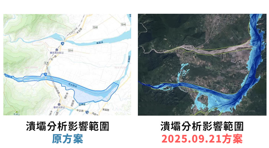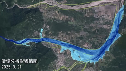 陽明交通大學防災與水環境研究中心主任林志平說明,研究團隊曾模擬過堰塞湖因颱風豪雨、地震潰壩,溢流口下切50公尺、100公尺等不同情境,而因為馬太鞍溪橋南岸堤防有缺口,因此大多模擬結果都顯示,潰壩後洪水主要會往南邊的光復市區溢流。