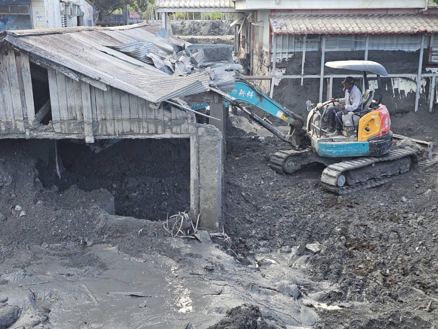 挖土機、小山貓等大型機具進入重災區佛祖街清挖,由於連日放晴,部分淤泥呈現乾硬狀態,民眾得用力才能敲下來。