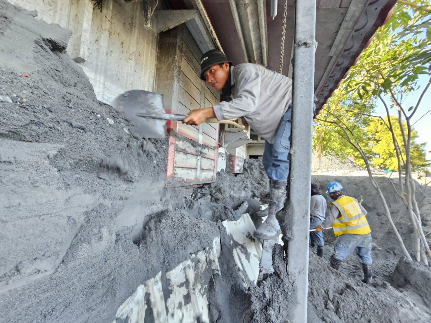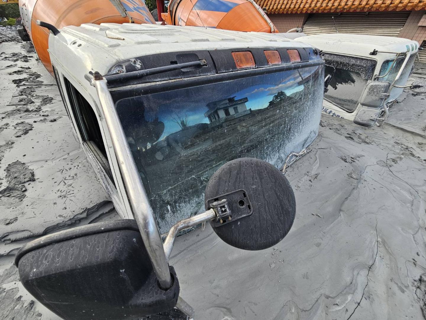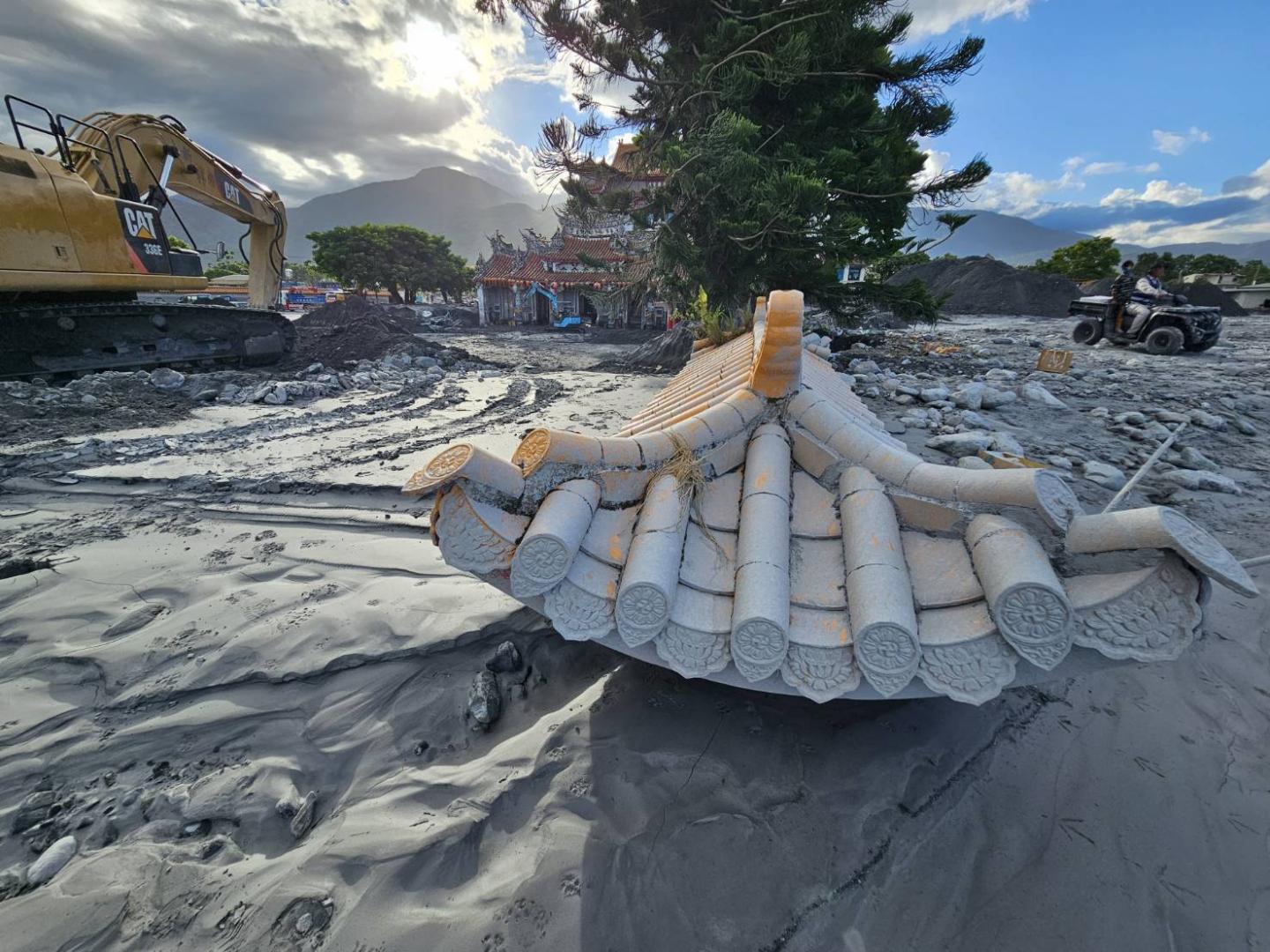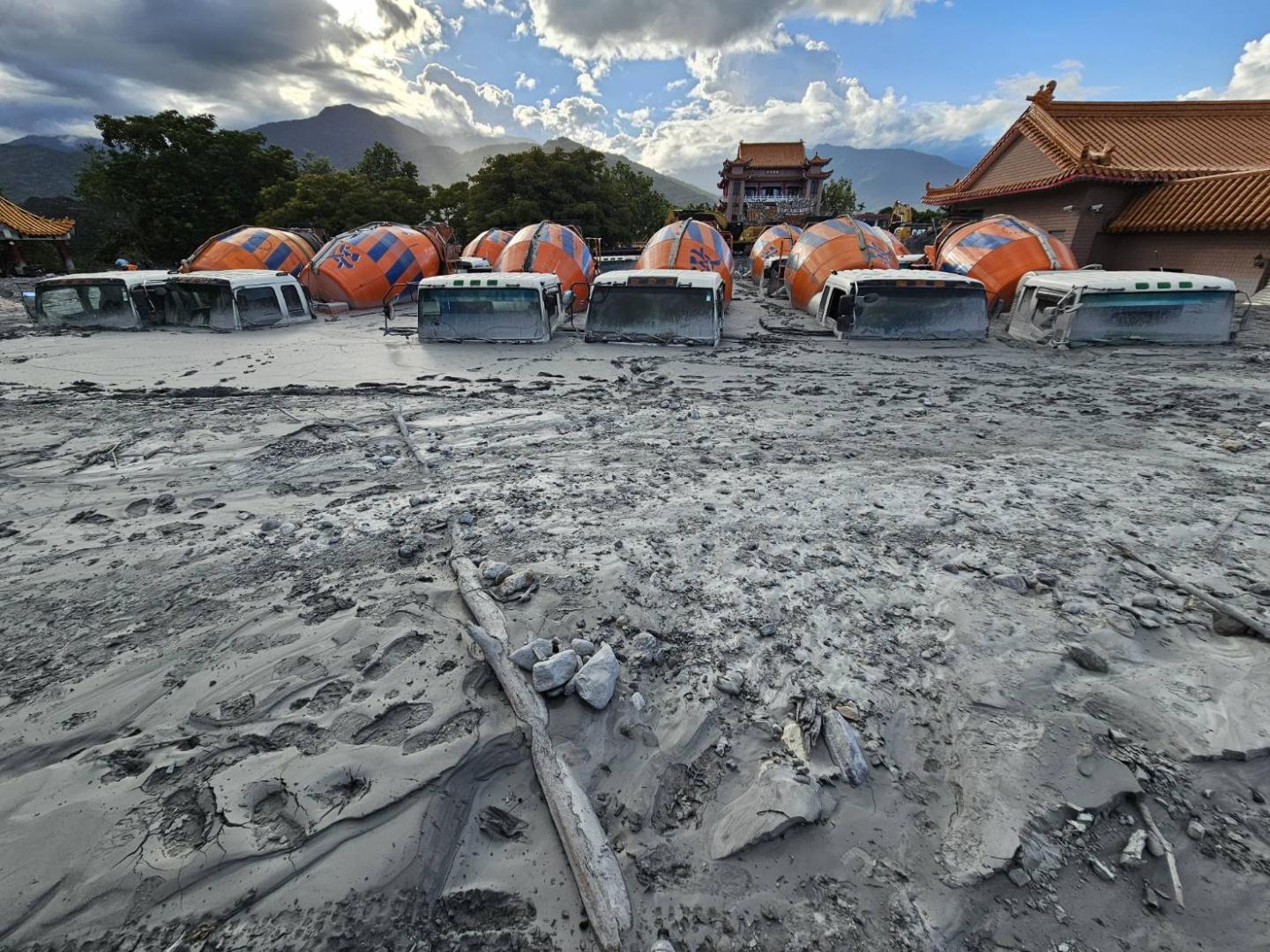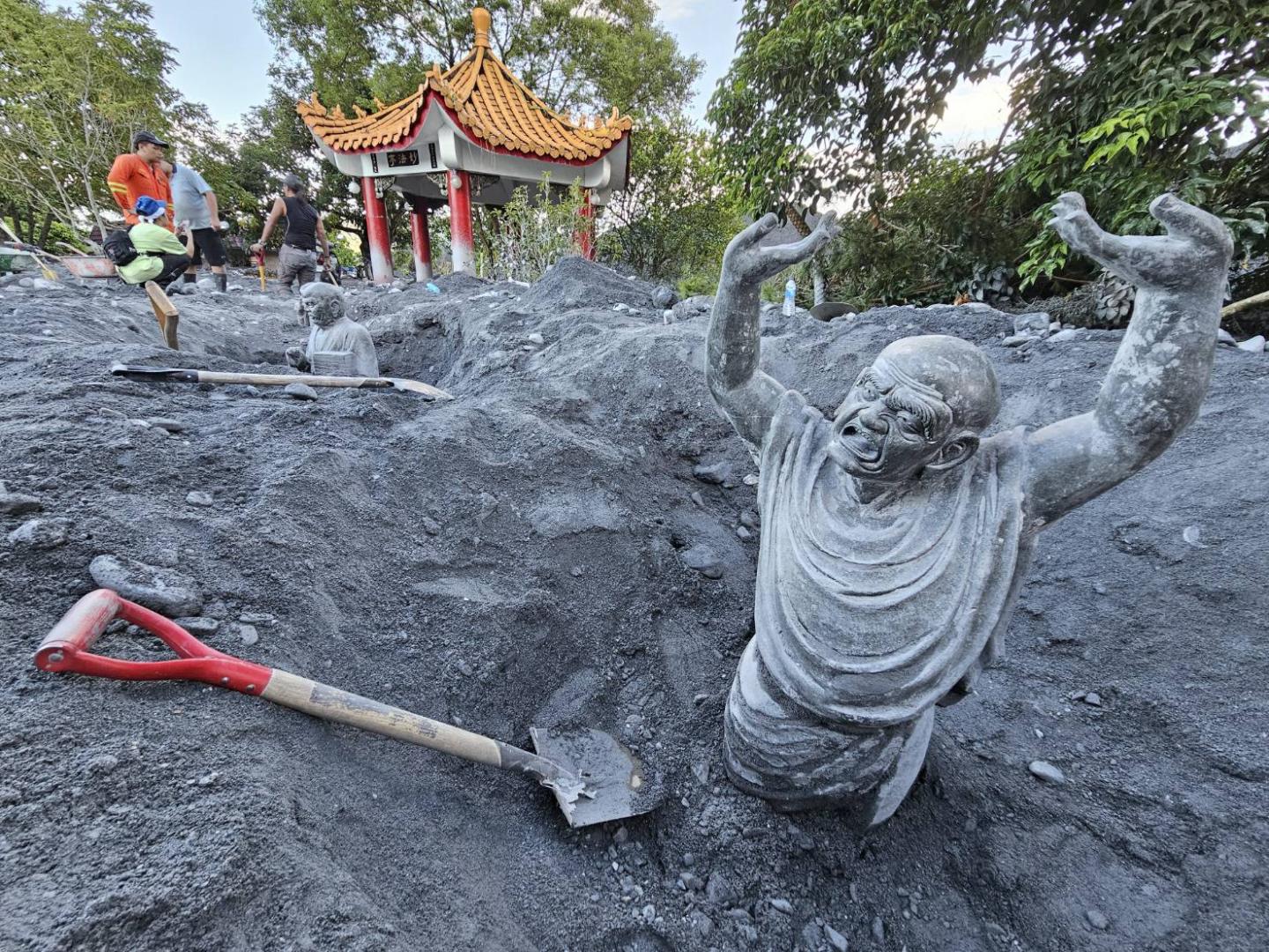 而信仰中心保安宮被土石深埋約一尺高,民眾先行挖開受困神像,多輛水泥預拌車仍陷落在沙堆之中。