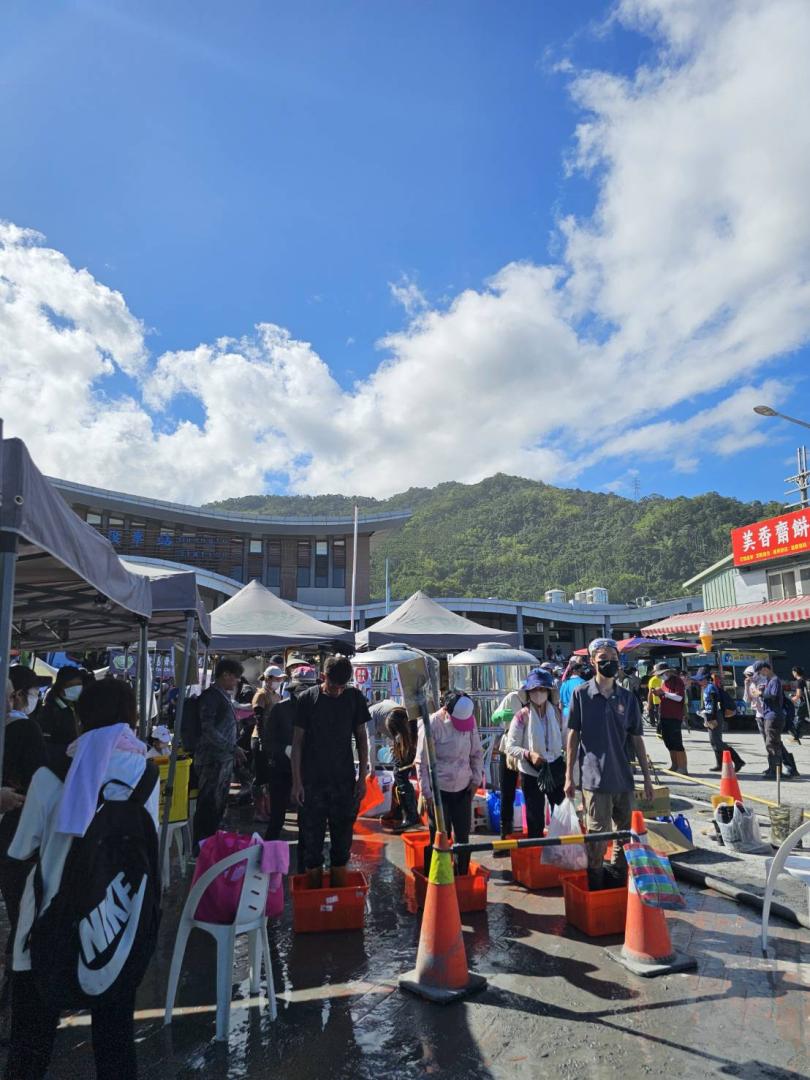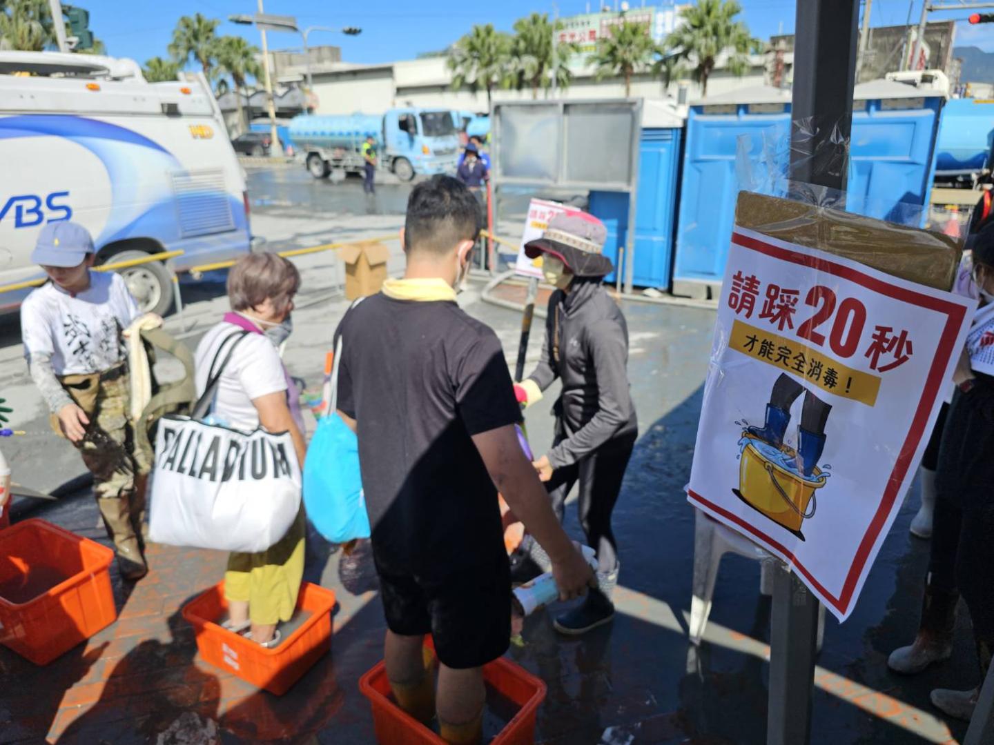 中秋連假即將展開,花蓮光復火車站前,部分道路淤泥已經清除,志工替準備搭車返家的鏟子超人清潔雨鞋,並進行消毒。