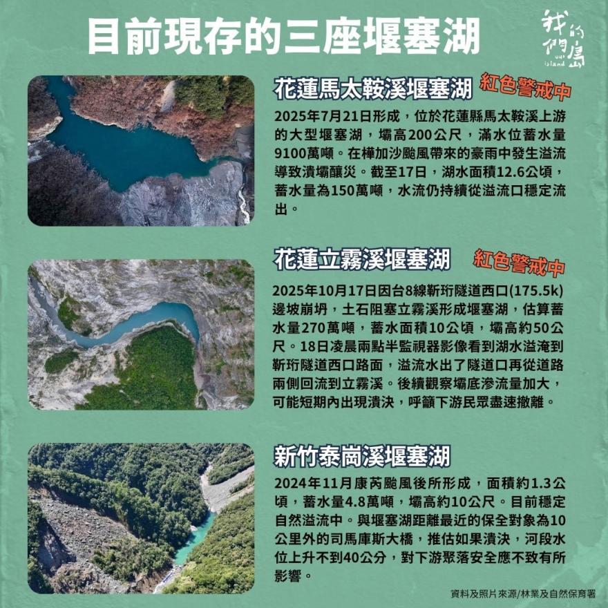 2025年7月21日形成,位於花蓮縣馬太鞍溪上游的大型堰塞湖,壩高200公尺,滿水位蓄水量9100萬噸。在樺加沙颱風帶來的豪雨中發生溢流導致潰壩釀災。截至17日,湖水面積12.6公頃,蓄水量為150萬噸,水流仍持續從溢流口穩定流出。