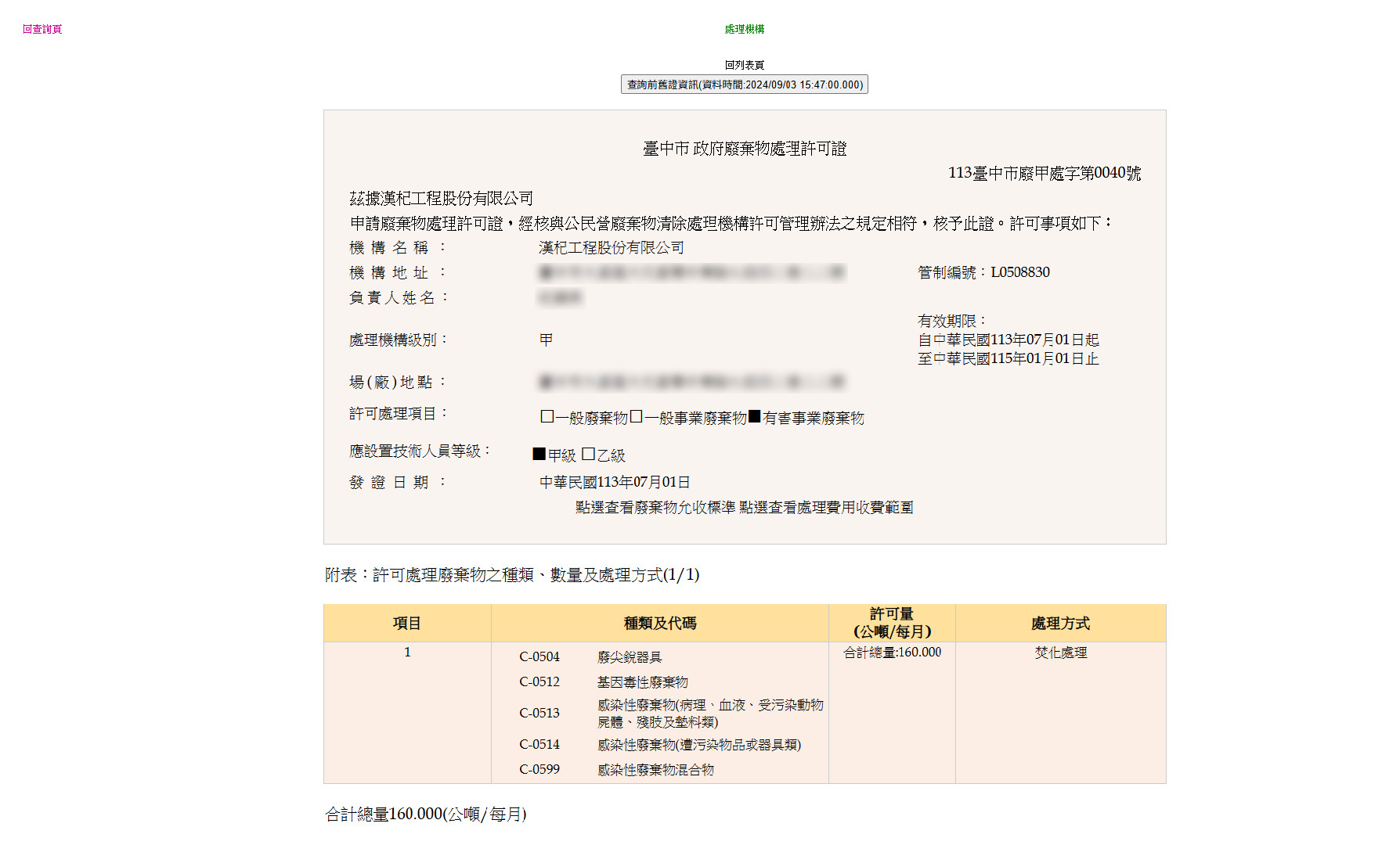 漢杞公司收受的事業廢棄物項目包括廢尖銳器具、基因毒性廢棄物、感染性廢棄物(病理、血液、受污染動物屍體、殘肢及墊料類)及其混合物。