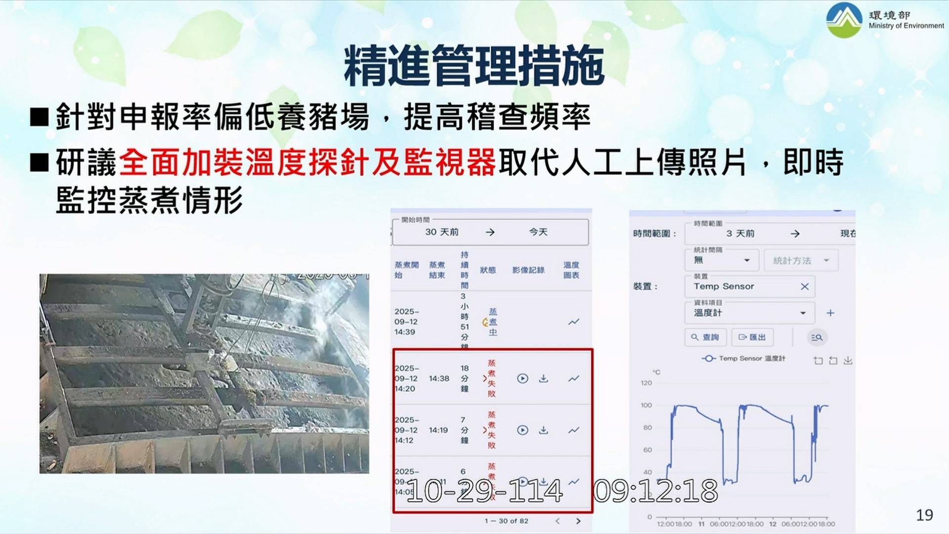環境部長彭啓明在立法院答詢時表示,針對申報率偏低,會要求提高稽查頻率,並研議全面加裝溫度探針及監視器,取代人工上傳照片,即時監控蒸煮情形。