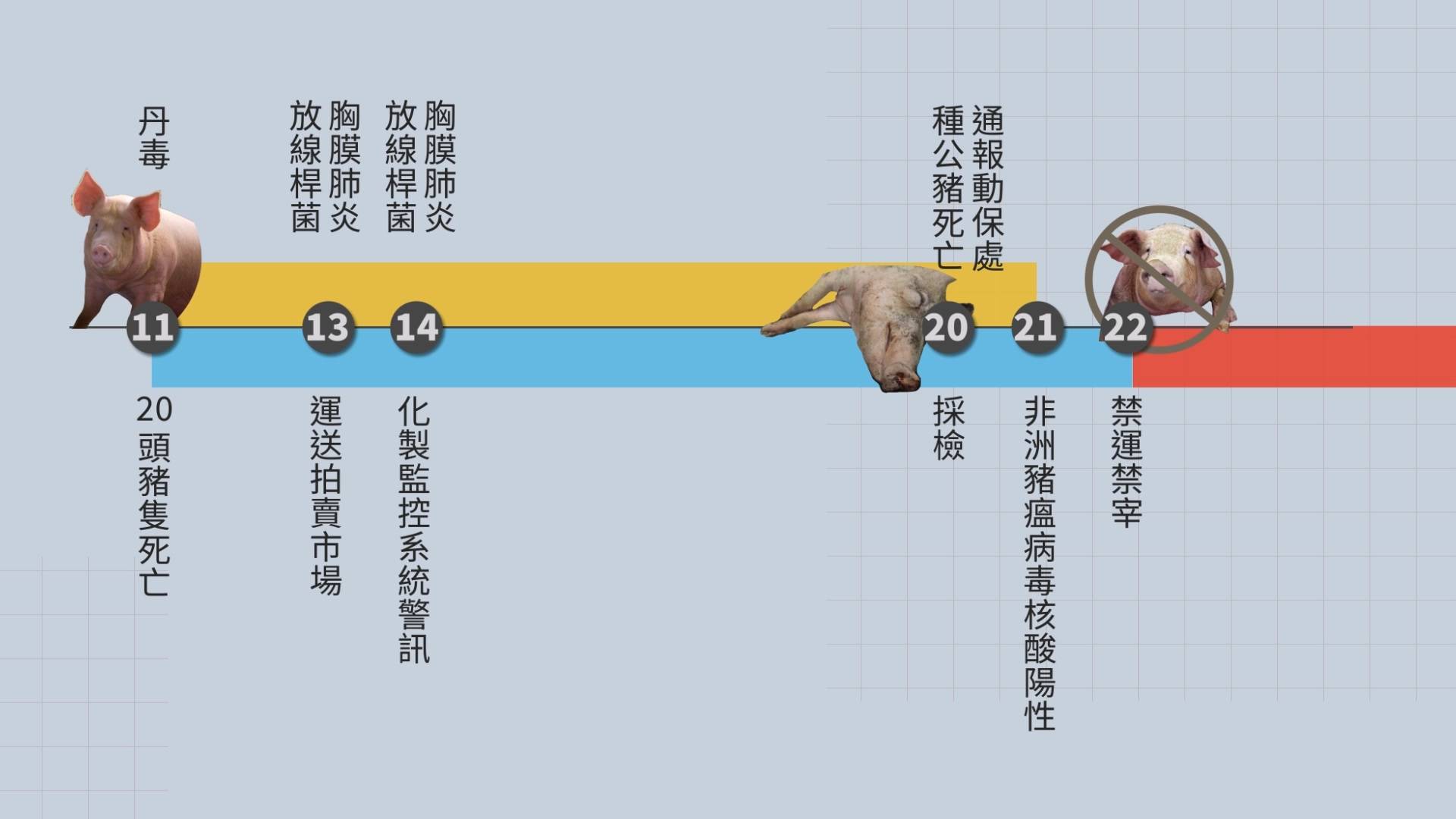 時間回到10月21日,上午11點44分,獸醫研究所接獲台中市動保處送檢的死亡豬隻檢體。晚上6點06分,農業部收到獸醫所初步檢驗結果通知,非洲豬瘟病毒核酸呈陽性,隨即召開緊急應變相關措施會議。