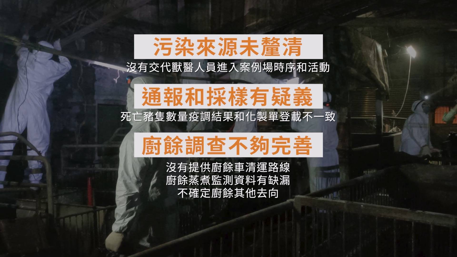 為了防堵疫情擴大,豬隻禁運、禁宰,暫停廚餘養豬。養豬場、肉品市場、運輸車輛全面大清消,同步進行疫情調查,追查可能的傳播鏈。如今危機解除了嗎?防疫破口可能有哪些?