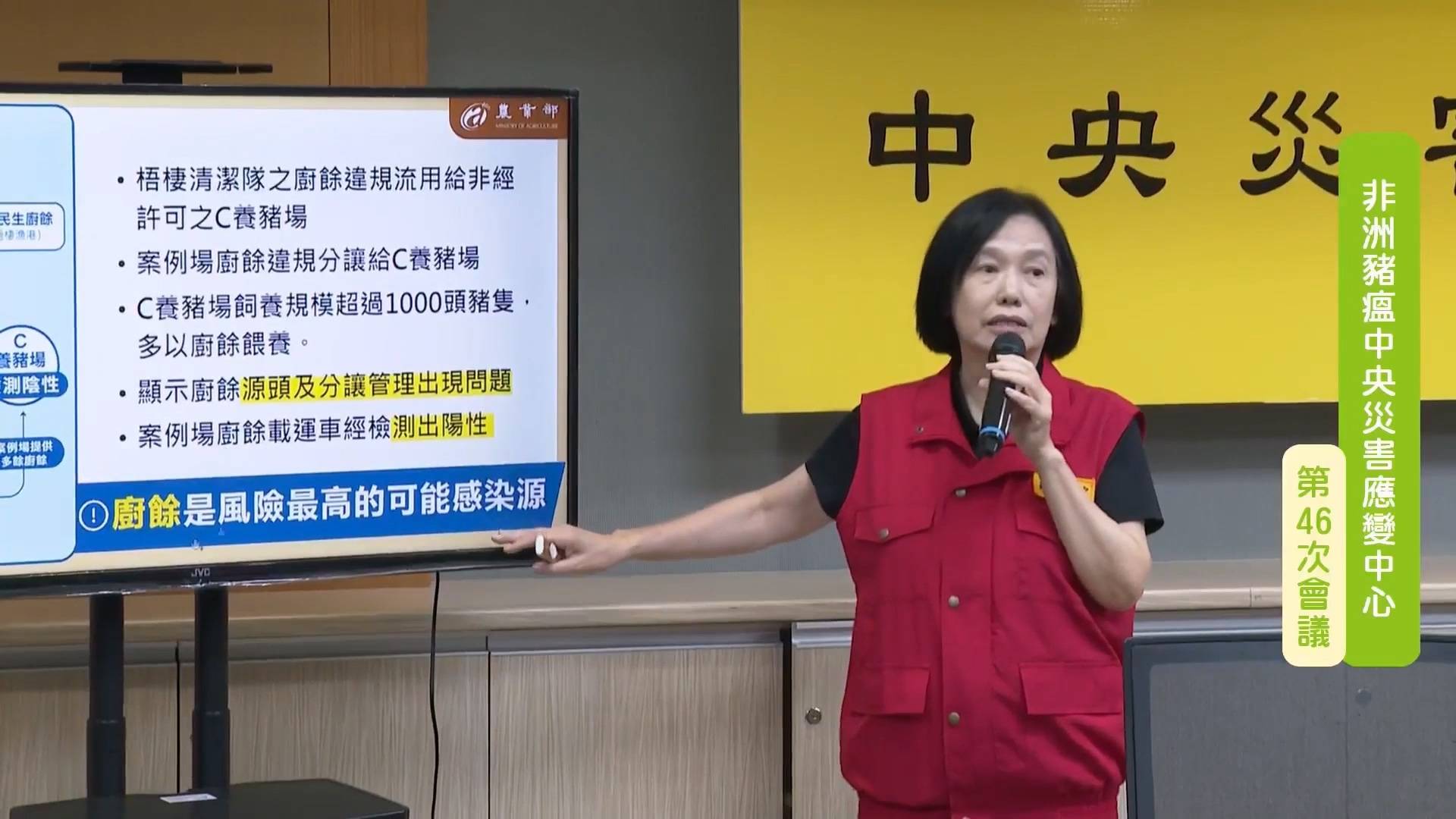 農業部次長杜文珍指出,千萬不要進到案例場,不只是只有案例場不能進去,所有的豬場這個時間真的不要進去,雖然非洲豬瘟不會感染人,但是人會成為機械性攜帶的一個媒介,所以真的不要進到豬場。