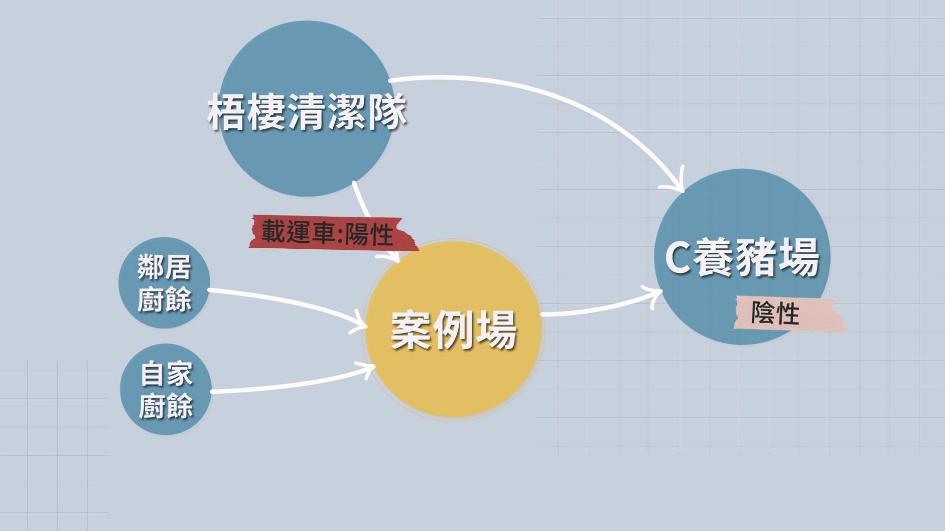 案例場除了收取梧棲清潔隊的廚餘,也收取附近鄰居的廚餘、使用自家廚餘,廚餘載運車也 測出病毒陽性,雖然這次病毒沒有擴散,但廚餘載運車本身就是行動感染源。