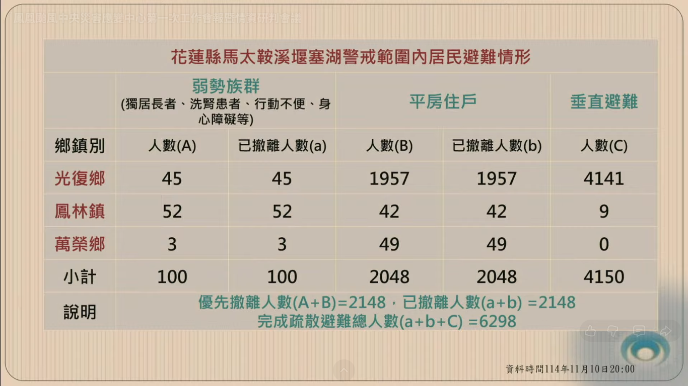 工作會報中,依據疏散撤離組的報告,統計至晚間八點,在馬太鞍溪堰塞湖警戒範圍內的光復鄉、萬榮鄉以及鳳林鎮,弱勢族群像是獨居長者、洗腎患者、行動不便等居民,已經有100人完成撤離,平房住戶則撤離2048人,垂直避難的有4150人,三鄉鎮加起來總共完成疏散避難6298人。光復鄉目前開設八處收容處所、鳳林鎮和萬榮鄉則是一處收容處所,秀林鄉開設兩處收容處所。
