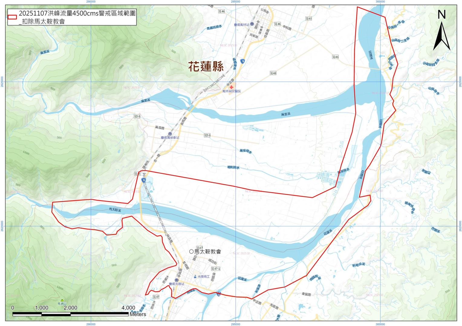 林保署花蓮分署完成模擬評估可能影響範圍,在颱風來臨前,8日提供給花蓮縣政府和光復鄉公所、萬榮鄉公所、鳳林鎮公所等單位,作為疏散撤離作業之用。這次可能影響範圍的評估模擬,是根據水利署加高堤防以及疏濬馬太鞍溪下游之後,設定極端情境之下的模擬:假設這次颱風帶來800毫米降雨量加上原堰塞湖現有150萬噸一次性潰決加上溢流口邊坡土石崩塌阻塞河道,就有可能會形成蓄水量1500萬噸的新生堰塞湖,模擬計算將產生4500cms的最大洪峰流量。