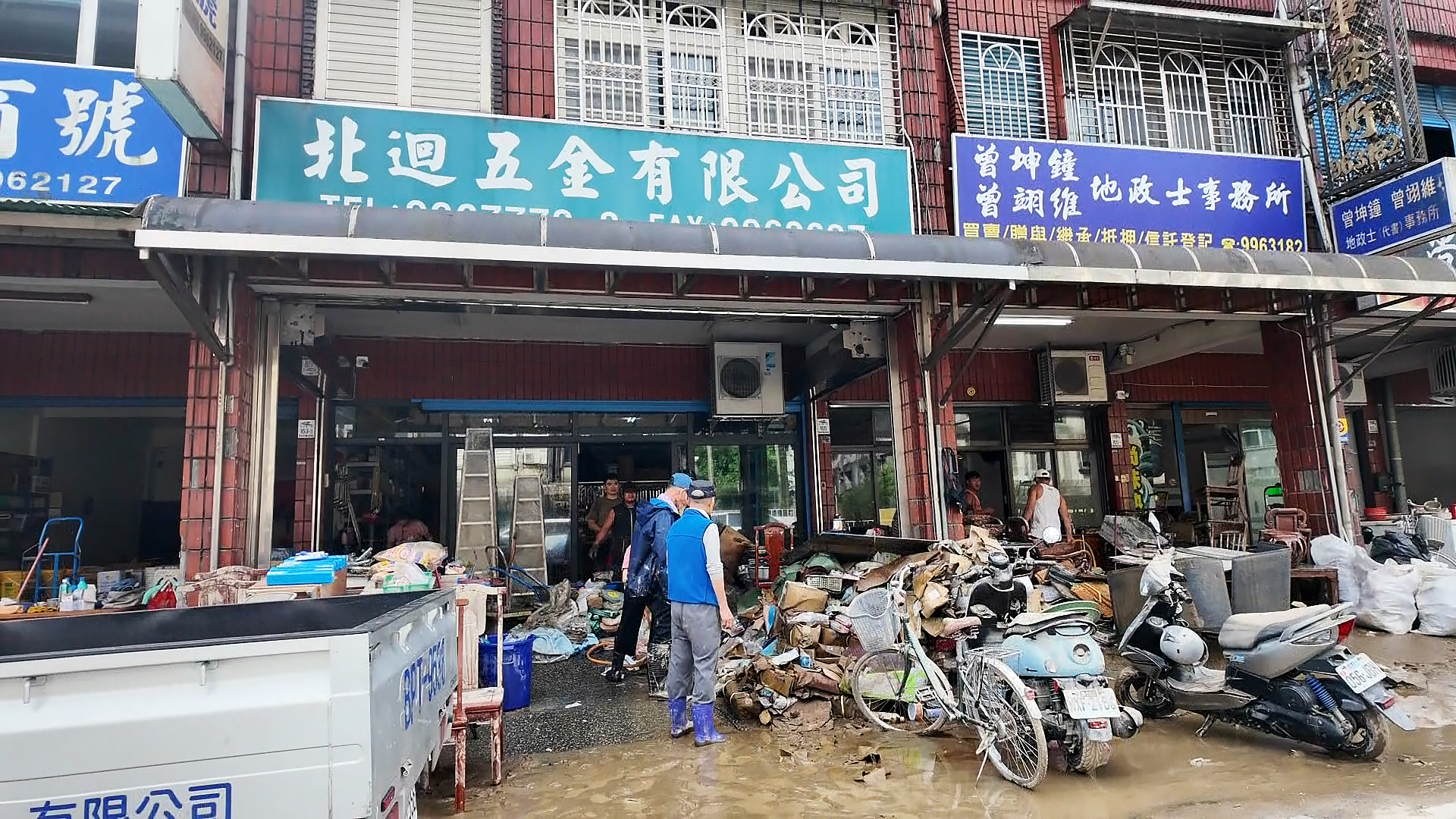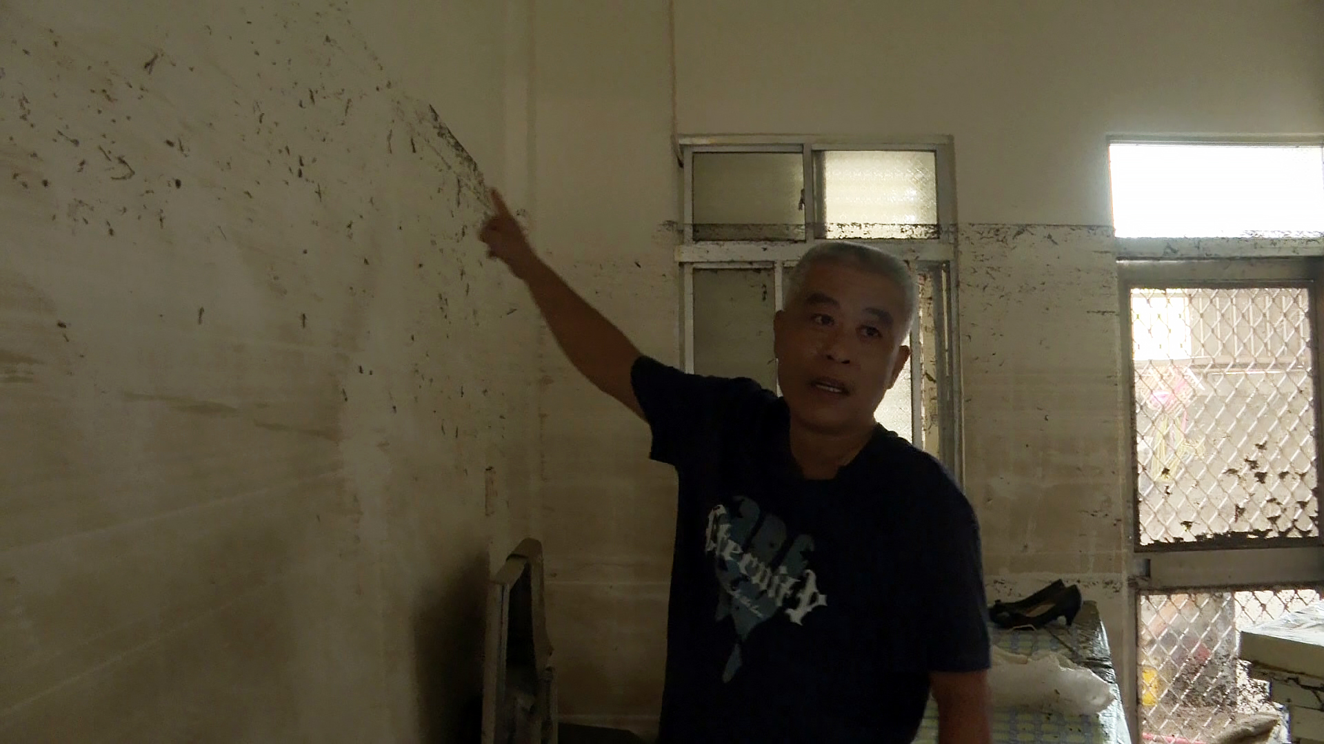 「昨天晚上六點水從後面湧進來,不到一小時整條路都淹掉。」居民林先生指著牆上的污痕,「退水後大概就剩現在這高度。十五年前也是這樣,一樓整個被淹掉。」另一個開餐館的店家站在滿是淤泥的廚房前,無奈地說:「冷凍設備泡過水都報廢了,至少一個月後才能重新營業。」