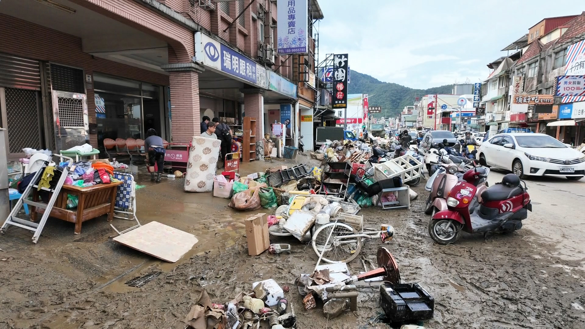 宜蘭蘇澳鎮最熱鬧的中山路,商家門口堆滿報廢的泡水家具、雜物。