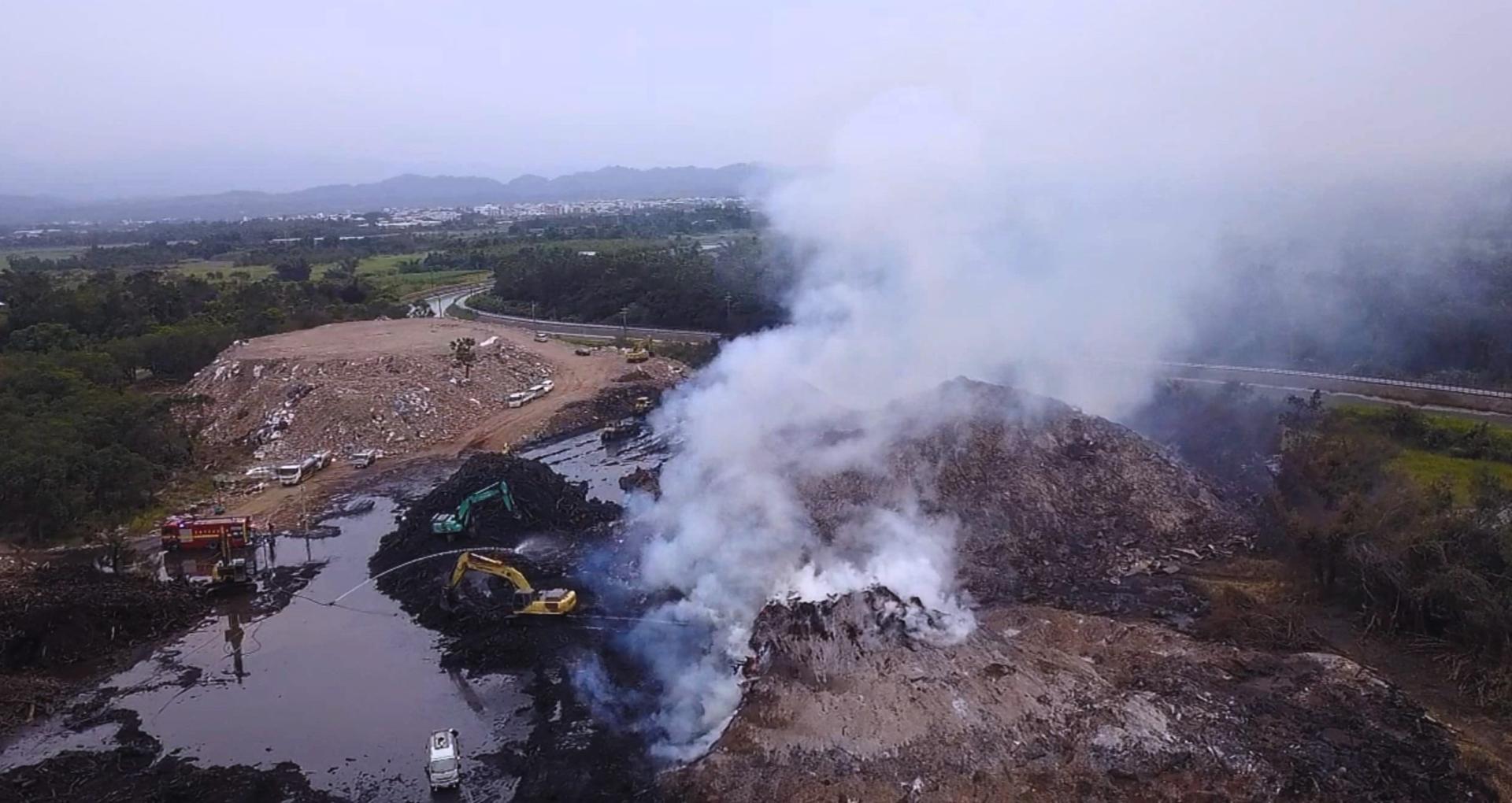 怪手在廢木材家具堆進行開挖跟噴水,另一處各種混雜的廢棄物也持續有火苗冒出。現場濃煙密布,為下風處居民帶來空污隱憂。