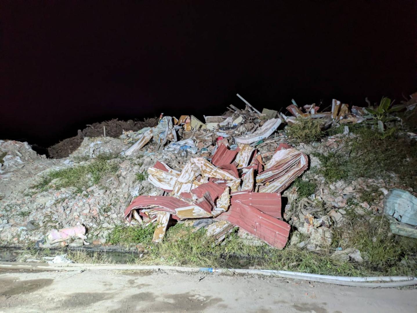 現場可見到堆置各種鐵皮、磚瓦、泡綿等混雜很多不同種類的廢棄物。