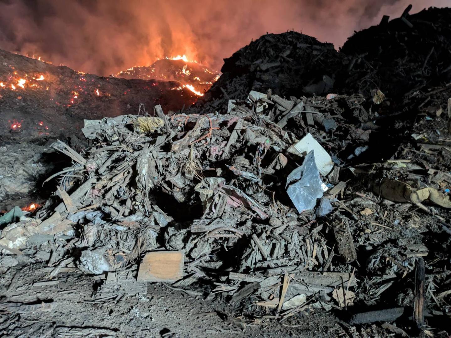 現場堆置的廢棄物,可見到有鐵皮、磚瓦、泡綿、廢木材、家具等等,混雜各種不同種類的廢棄物,焚燒過程中有很多五顏六色的火焰,顯示裡面有很多不同的化學跟金屬成分燃燒。