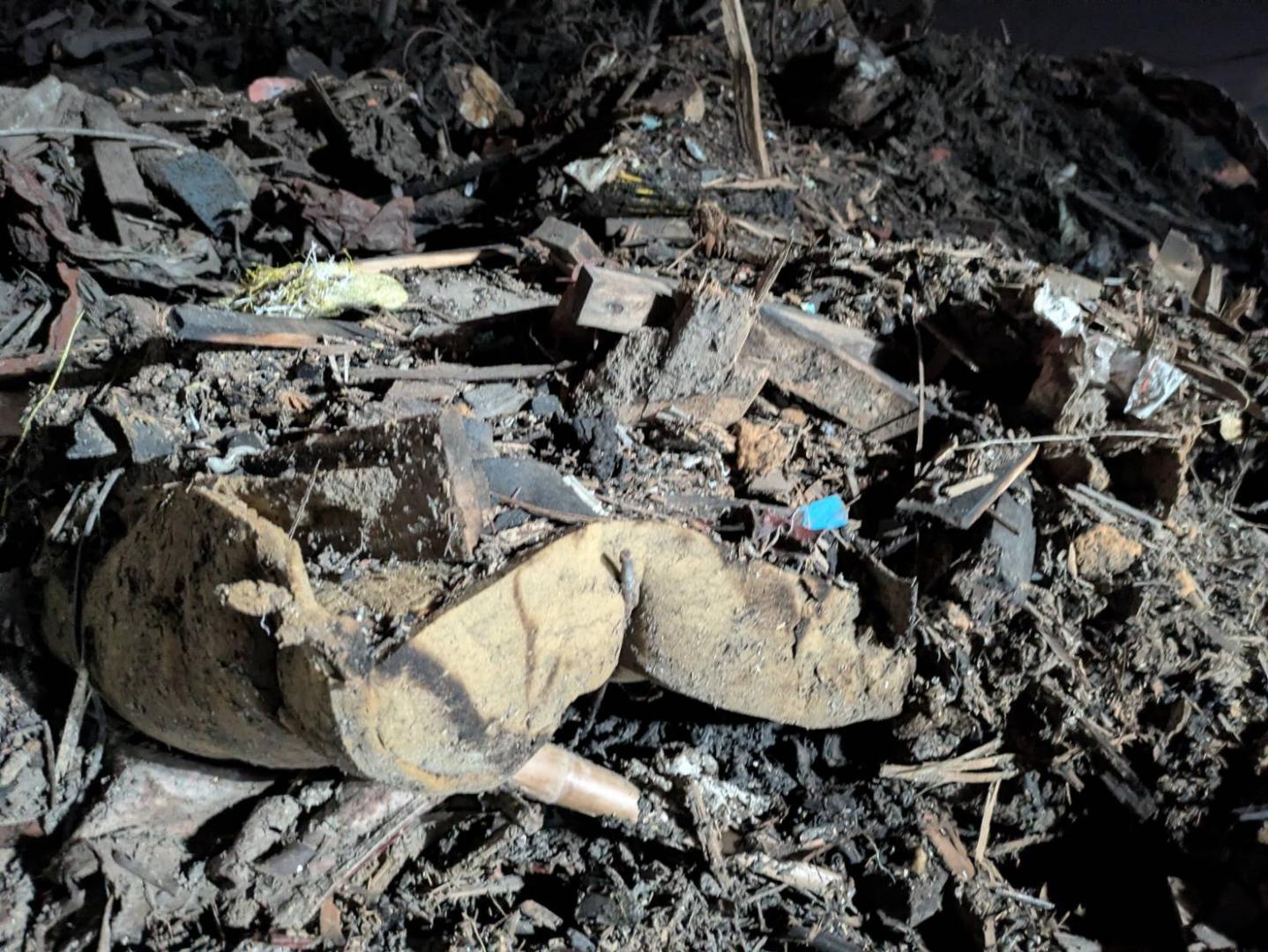 現場堆置的廢棄物,可見到有鐵皮、磚瓦、泡綿、廢木材、家具等等。