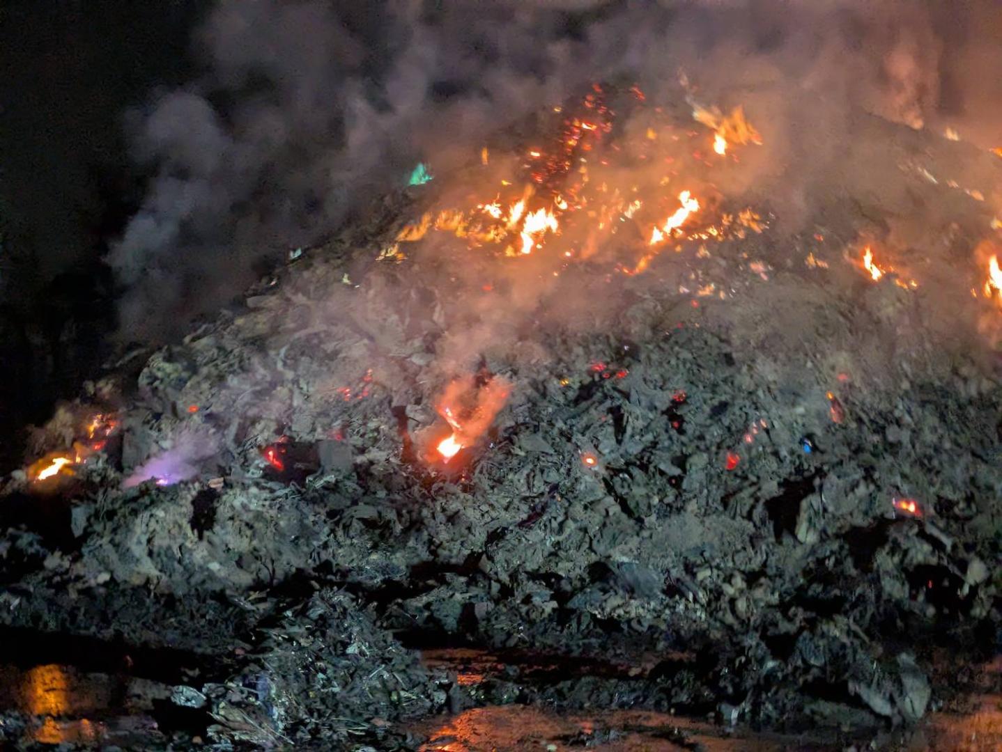 焚燒的廢棄物不時有五顏六色的火焰冒出,代表裡面有很多不同的化學跟金屬成分燃燒。