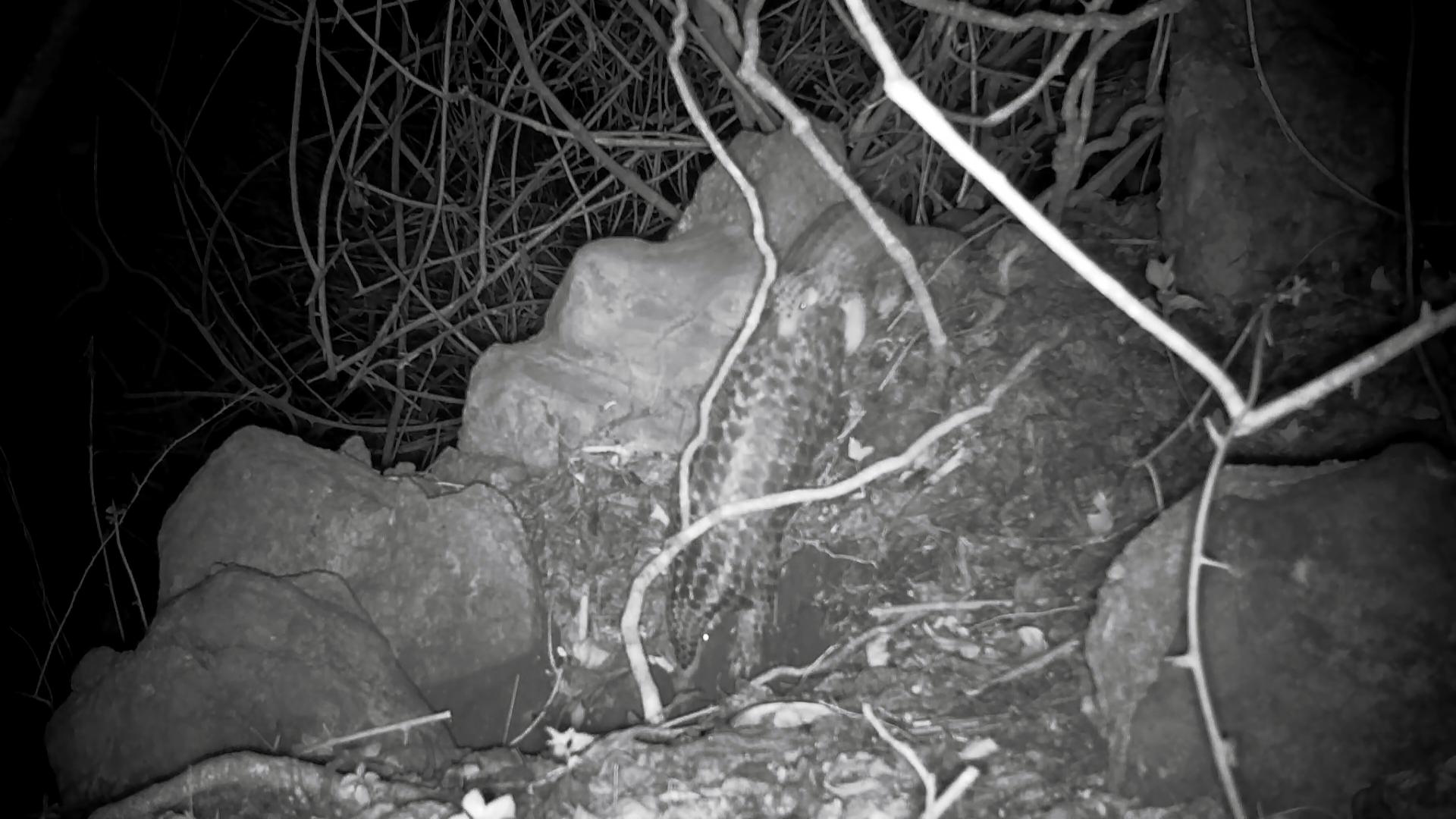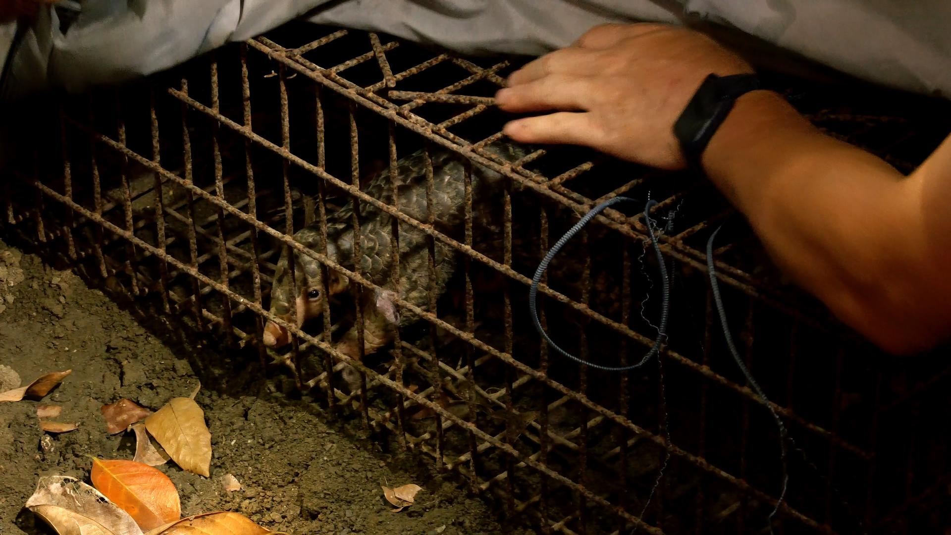 夜間在山區尋找穿山甲,簡直是辛苦的工作,在沒有路的山坡,居民摸索前行,朝向穿山甲方位前進。在不斷探索後,終於確定位置,來到穿山甲的洞穴。因為是申請許可的調查計畫,人們小心翼翼的挖開洞口,捕捉到穿山甲。