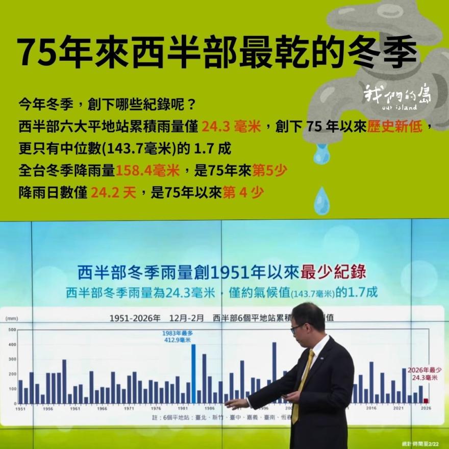 日前氣象署公布的春季展望記者會,發表今年冬季(2025年12月至2026年2月)的相關數據,全台冬季降雨量只有158.4毫米,約為氣候值(260.6毫米)的六成,排名是75年來(自1951年以來)第5少的;冬季降雨日數僅有24.2天,也是75年以來第4少。其中在西半部地區,台北、新竹、台中、嘉義、台南及恆春等六個平地站,累積雨量更是只有24.3毫米,是氣候值(143.7毫米)的1.7成,創下75年來的歷史新低紀錄。