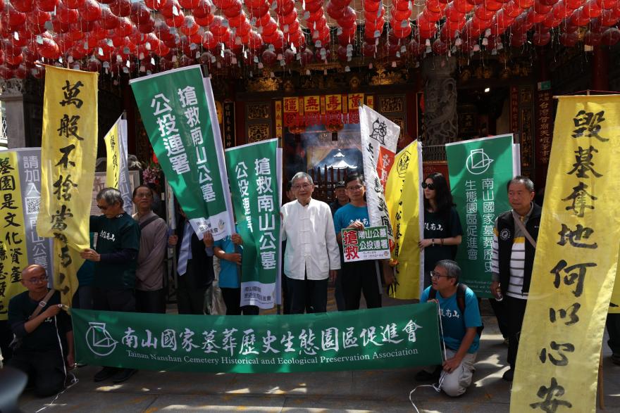 今日(3/1)上午,「南山國家墓葬歷史生態園區促進會」成員,在理事長吳昭明帶領下,來到台南天公廟,祈求神明保佑南山公墓能免於不當開發,並在天公廟旁民宅舉行記者會,宣告啟動地方性公投。