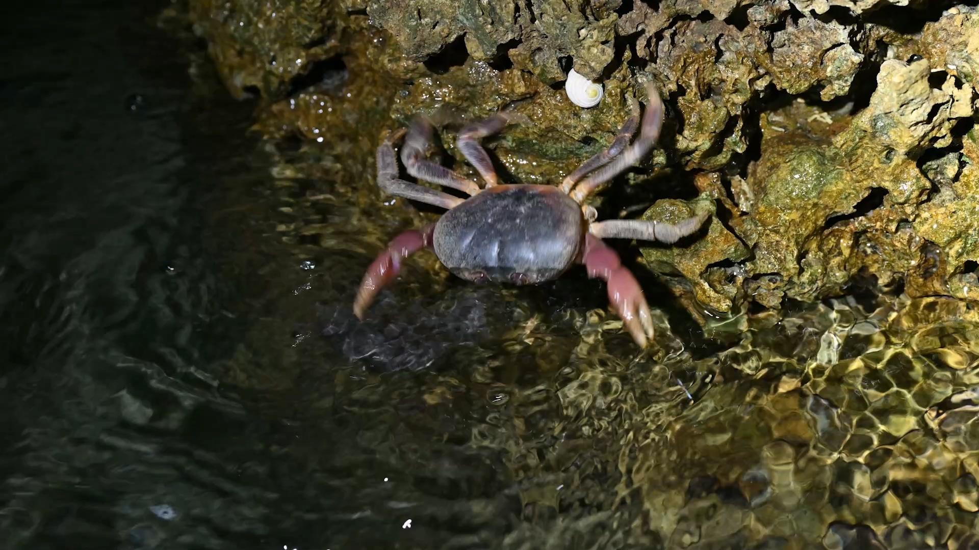 月色下,大腹便便的陸蟹媽媽,緩緩地爬上礁岩,朝大海的方向前進,當牠選定適合的位置站穩腳步,等待一波海浪到來,就會奮力擺動身體,把腹部的卵團拋向海水之中,即使已經從海洋演化在陸地生活,陸蟹的幼蟲還是必須回到海水中發育成長,每年五月到九月的繁殖期 ,抱卵的母蟹會從棲息的海岸林出發,來到海邊生產,這一路上要克服層層關卡。
