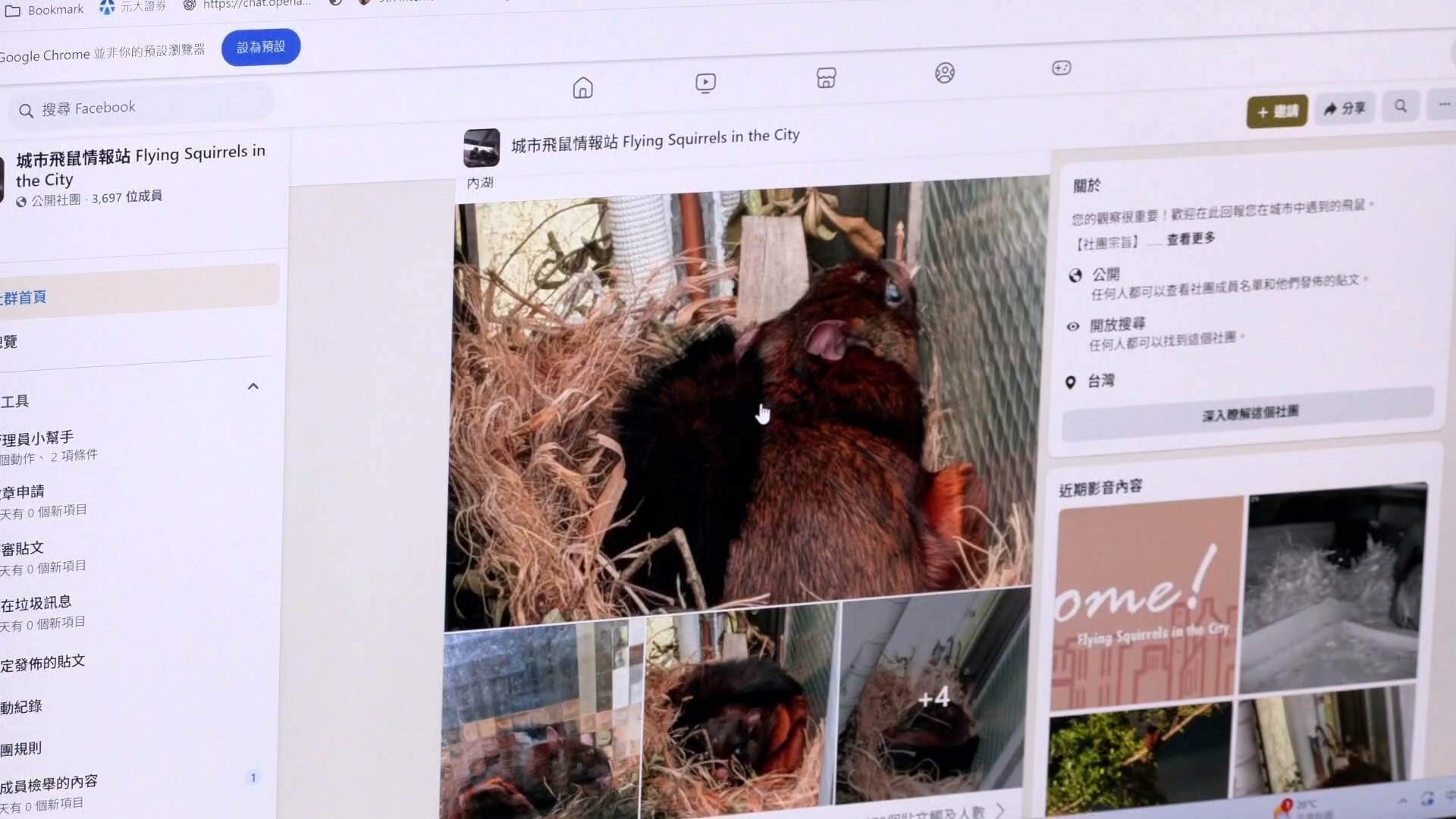 網路上,有許多飛鼠在城市出沒的影像,陳相伶老師設立「城市飛鼠情報站」,利用公民科學調查,收集相關資訊。透過許多民眾提供影像,觀察到飛鼠的生態行為,許多超乎過去想像。陳相伶強調,飛鼠大量出現在城市,不該視為常態,而是應該思考棲地變化的問題。