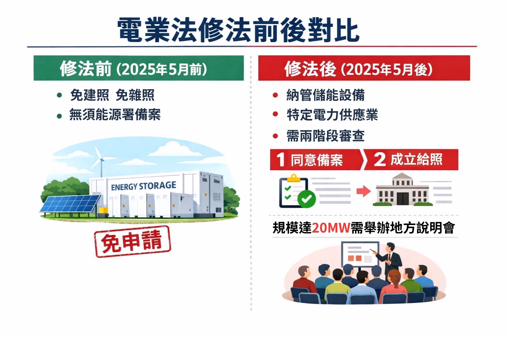 過去《電業法》並未將儲能設備納管,屬於免建照、免雜照項目,也不需事前備案即可動工。直到2025年5月修法後,新增「特定電力供應業」,正式將大型儲能設備納入管理。