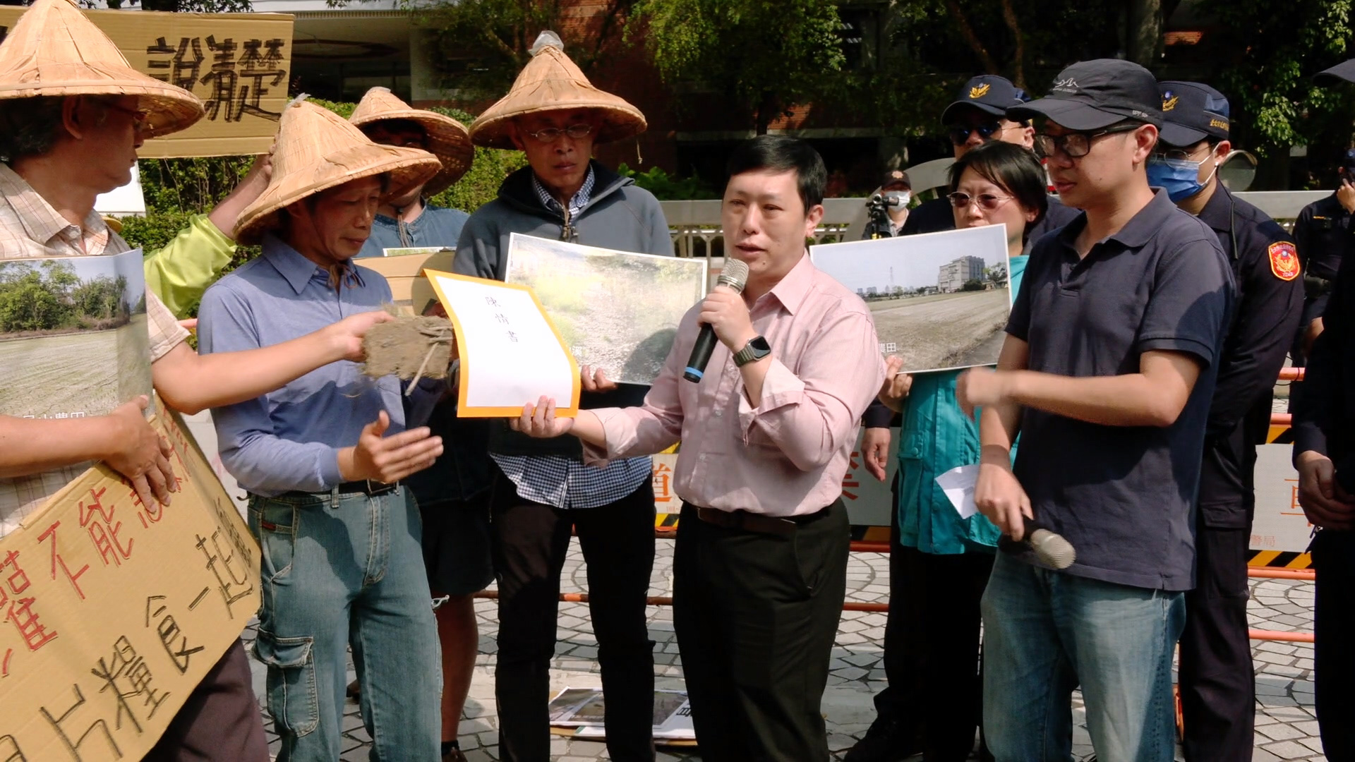 面對缺水停灌,抗議團體批評工業搶水,農民總是被犧牲。為了追求經濟發展,在台灣各地,高科技的生產園區不斷趕工興建。抗議現場由農田水利署管理組朱志彬出面接受陳情書,表示將帶回研議。農田水利署發布新聞稿回應,表示該計畫並非強制停灌,且農民可自由選擇是否參與。(相關新聞:新竹農民抗議節水試辦計畫 民團批為科技園區用水犧牲農業)