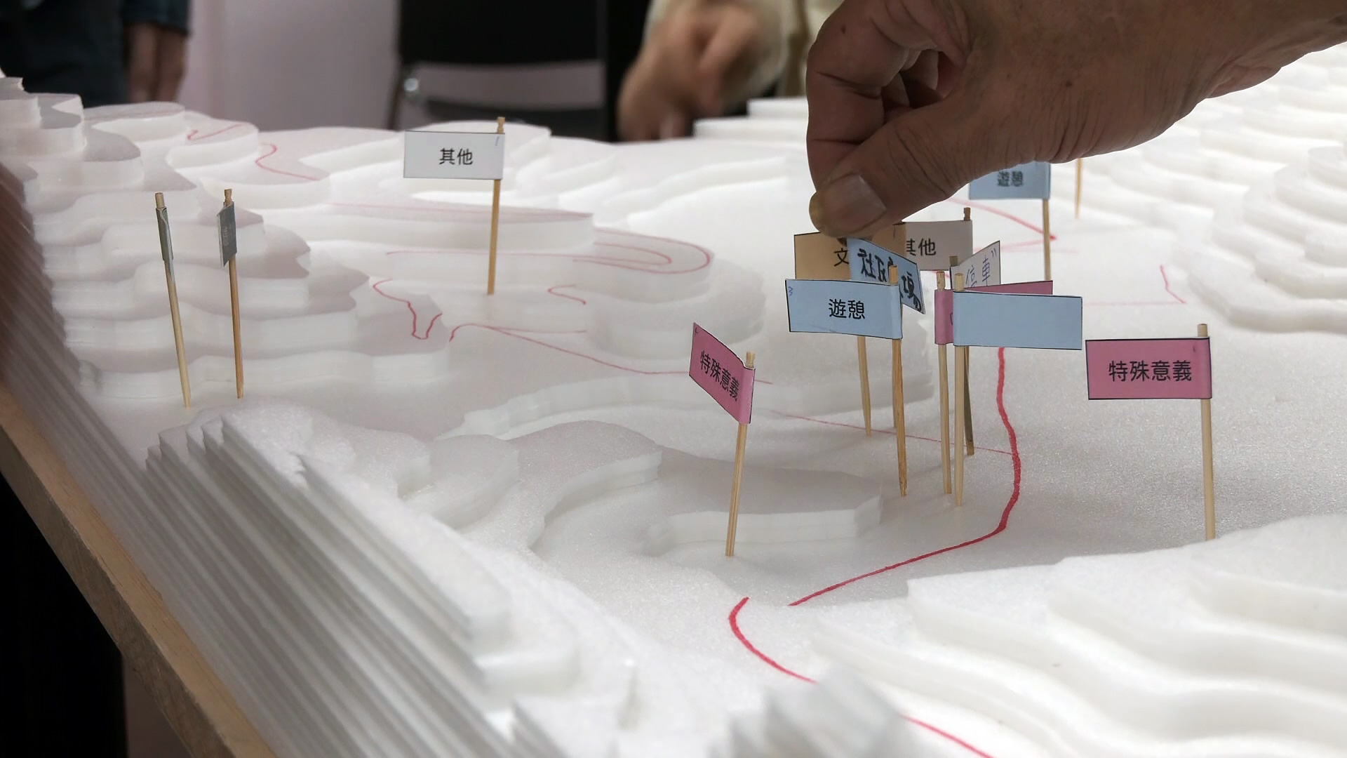 東海大學研究團隊準備了蓮華池的地景模型,邀請參與的學員標示對地方的記憶。