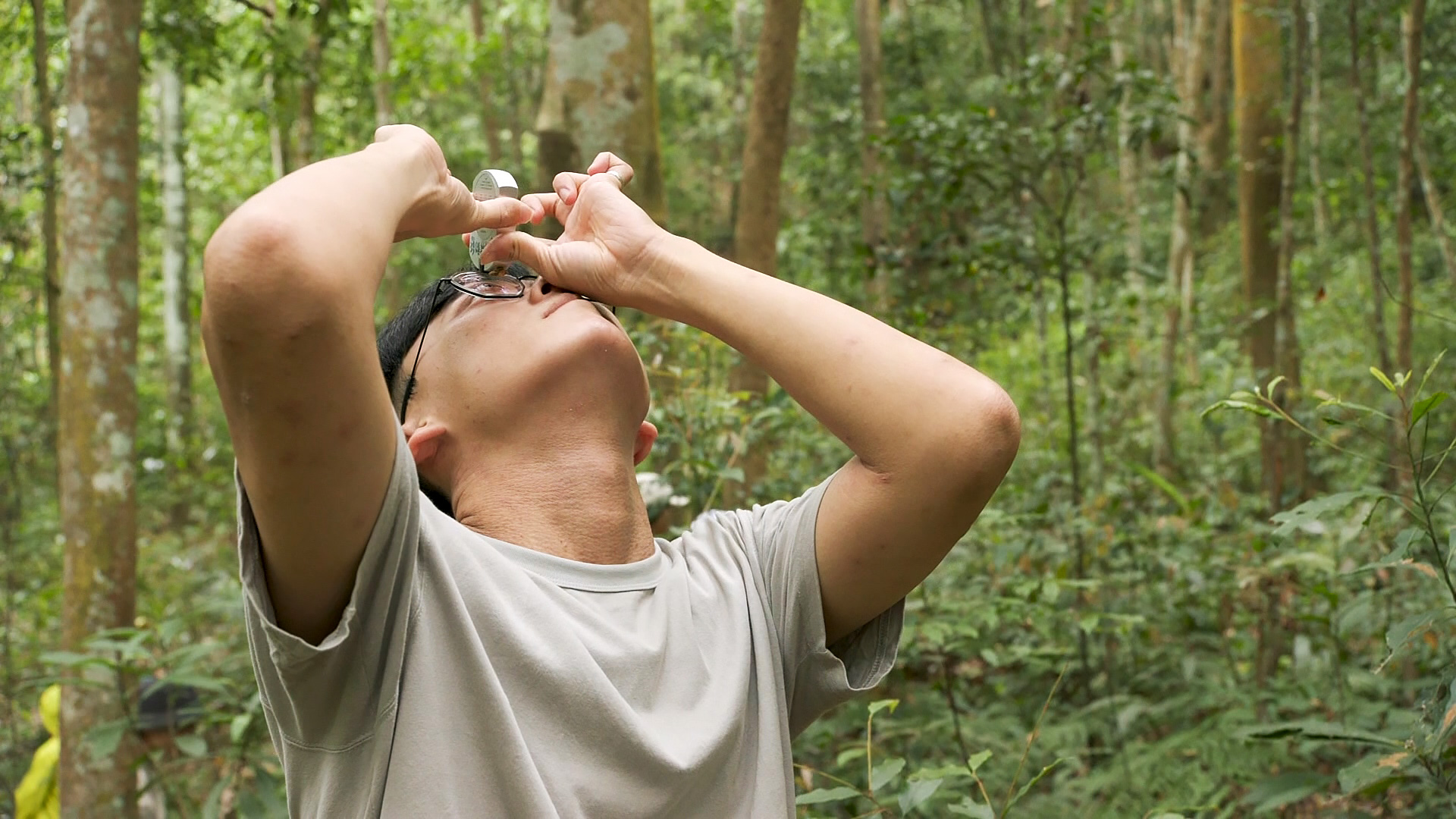 東海大學教授林宜靜帶領國小老師們在森林中學習計算樹木的碳匯量。根據估算,蓮華池天然林的地上部碳庫存量每公頃約88.8公噸的碳,土壤更蓄積了地上部六成的碳,顯示這片森林對氣候調適的重要性。