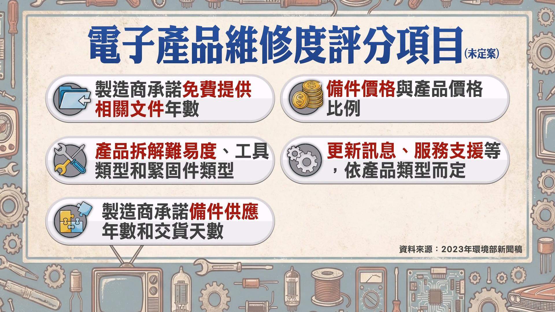 消費者要如何得知自己購買的產品是否容易維修?法國從2021年開始,強制要求手機、筆電、電視機等家電標示維修度指數,滿分是十分。台灣也曾在2023年,參考法國的制度訂定維修度評分項目,包含是否提供維修說明書等相關文件、產品拆解難易度、零件供應與價格等等。不過目前尚未正式推行。