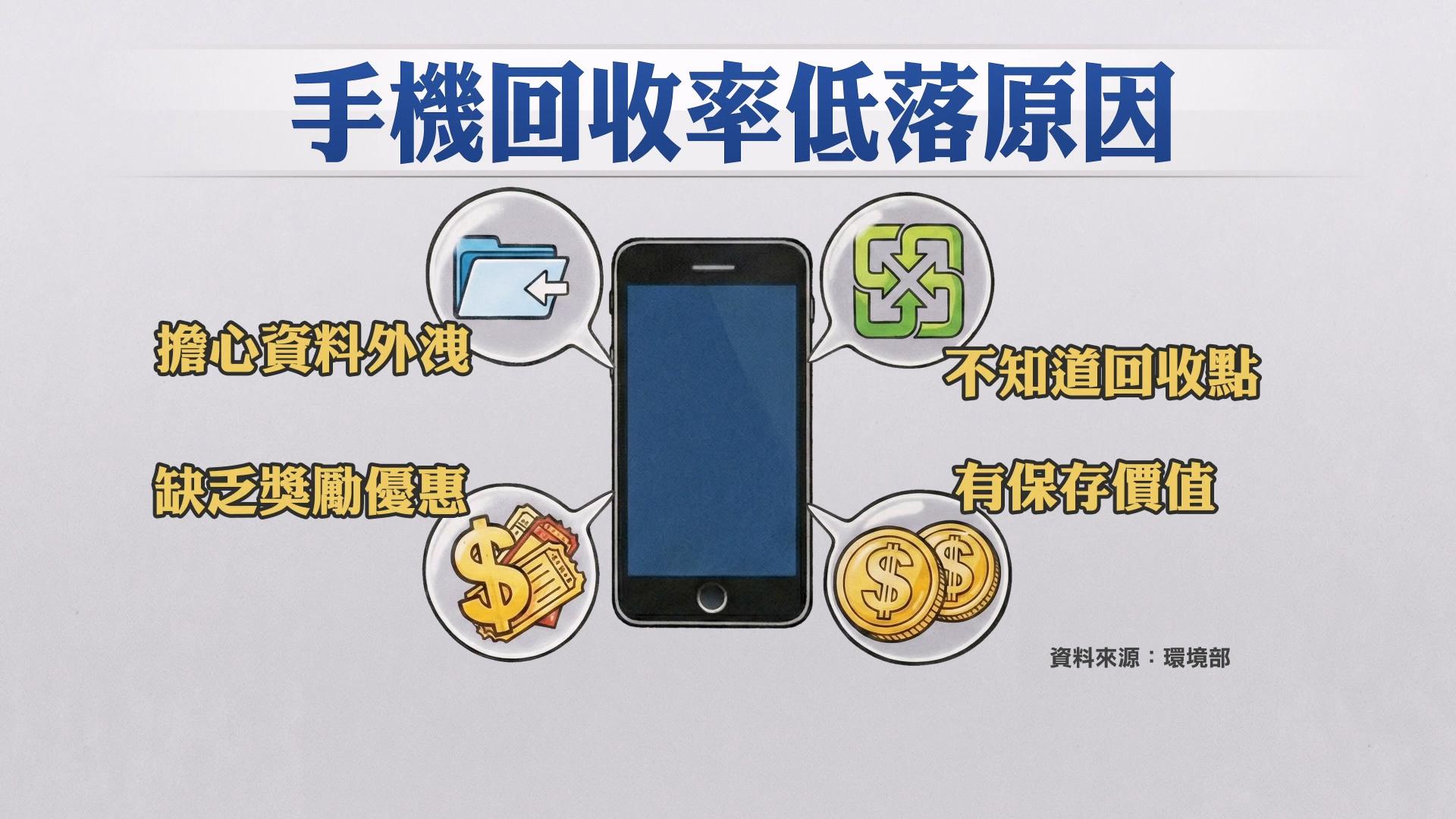 根據環境部資料,台灣目前的手機回收率僅有12%,低於日本、歐盟的15%。環境部曾做過問卷調查,發現手機回收率低落的原因,包含民眾擔心資料外洩、缺乏獎勵優惠、不知道去哪裡回收、認為有保存價值等等。有超過五成的民眾,習慣把舊手機放在家裡。