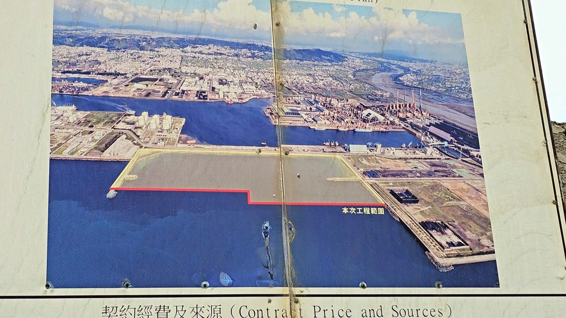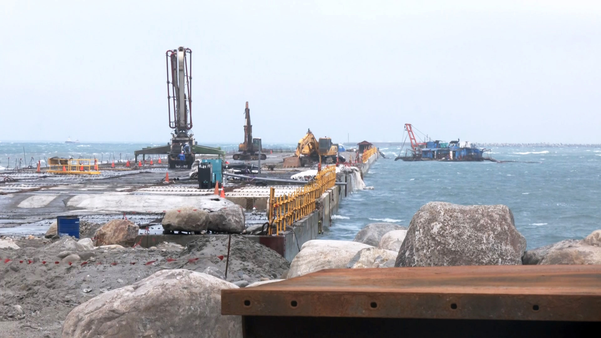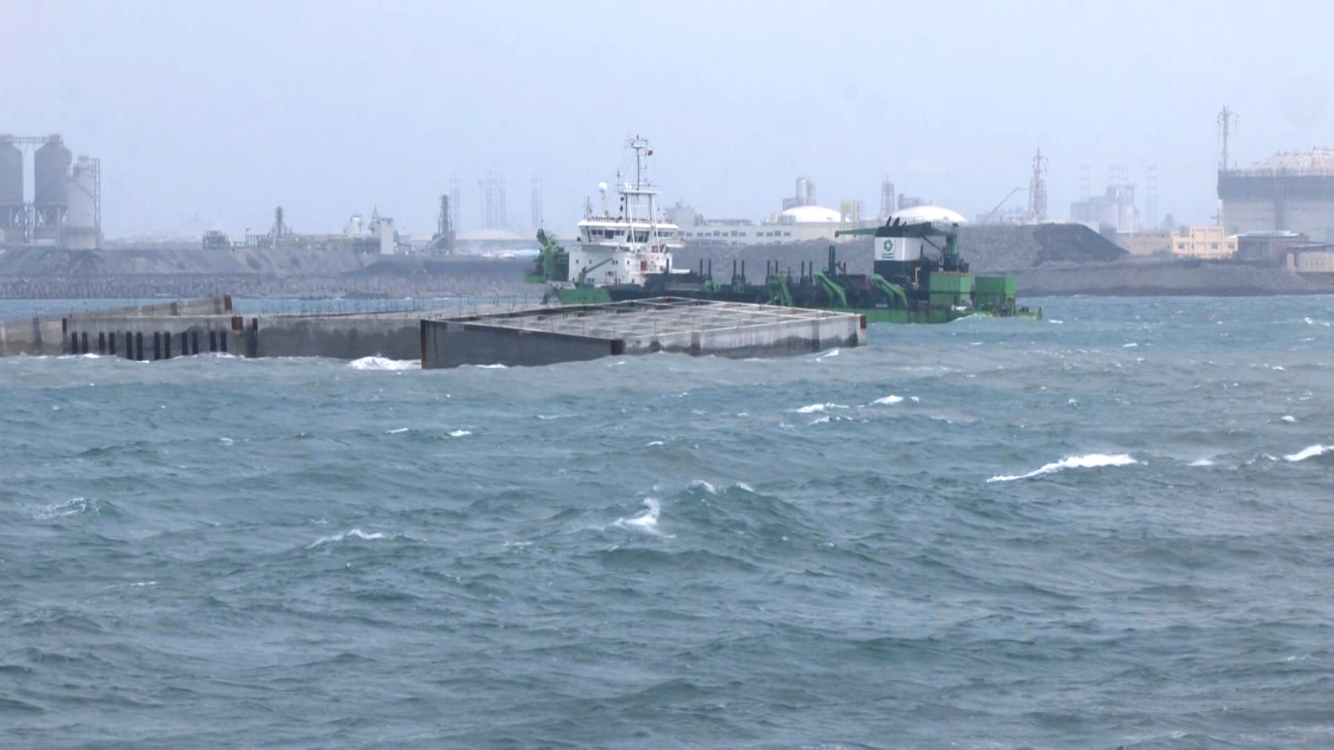 目前台中港區因東北季風造成風浪過大,暫時停工中。
