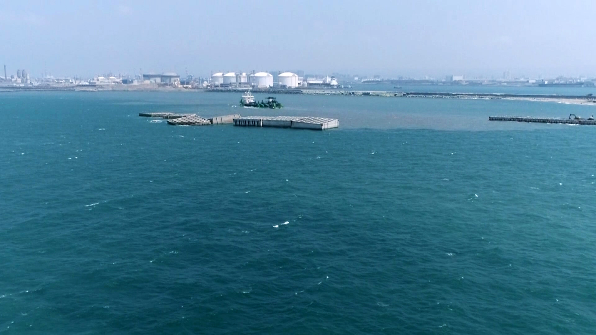 台中港新建填方區海堤工程在白海豚生活的海域放置沈箱。