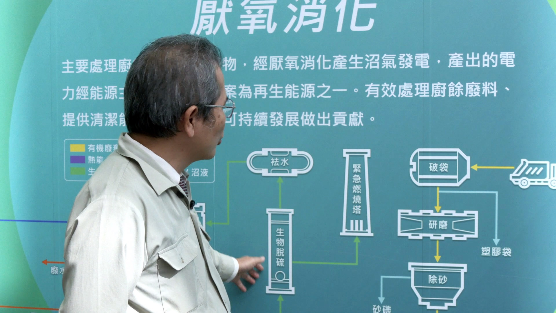 綠能公司副總陳耀才說明:「厭氧消化最主要就是用微生物來處理廚餘,微生物經過反應後,會有沼氣的產生,沼氣經過生物脫硫、除水,就會送到發電機來做發電。」