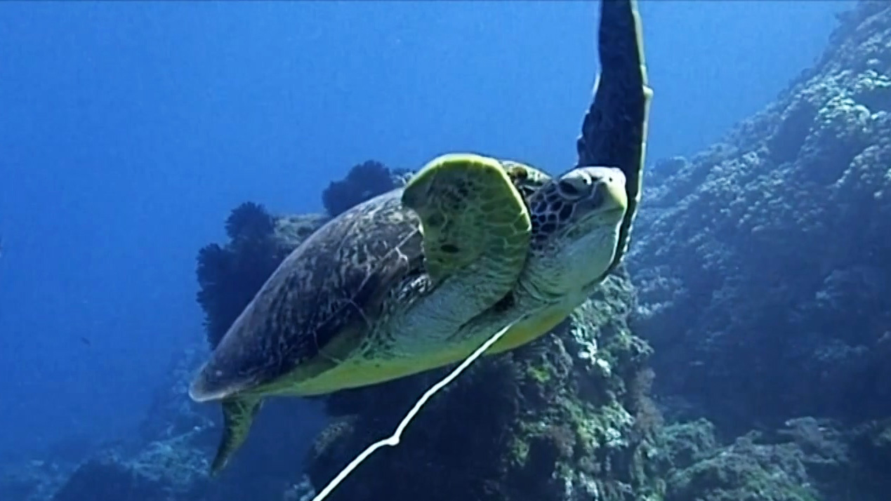 這隻被暱稱為「小強」的海龜,第一次被目擊時身上纏繞著魚線。影像提供/海龜點點名