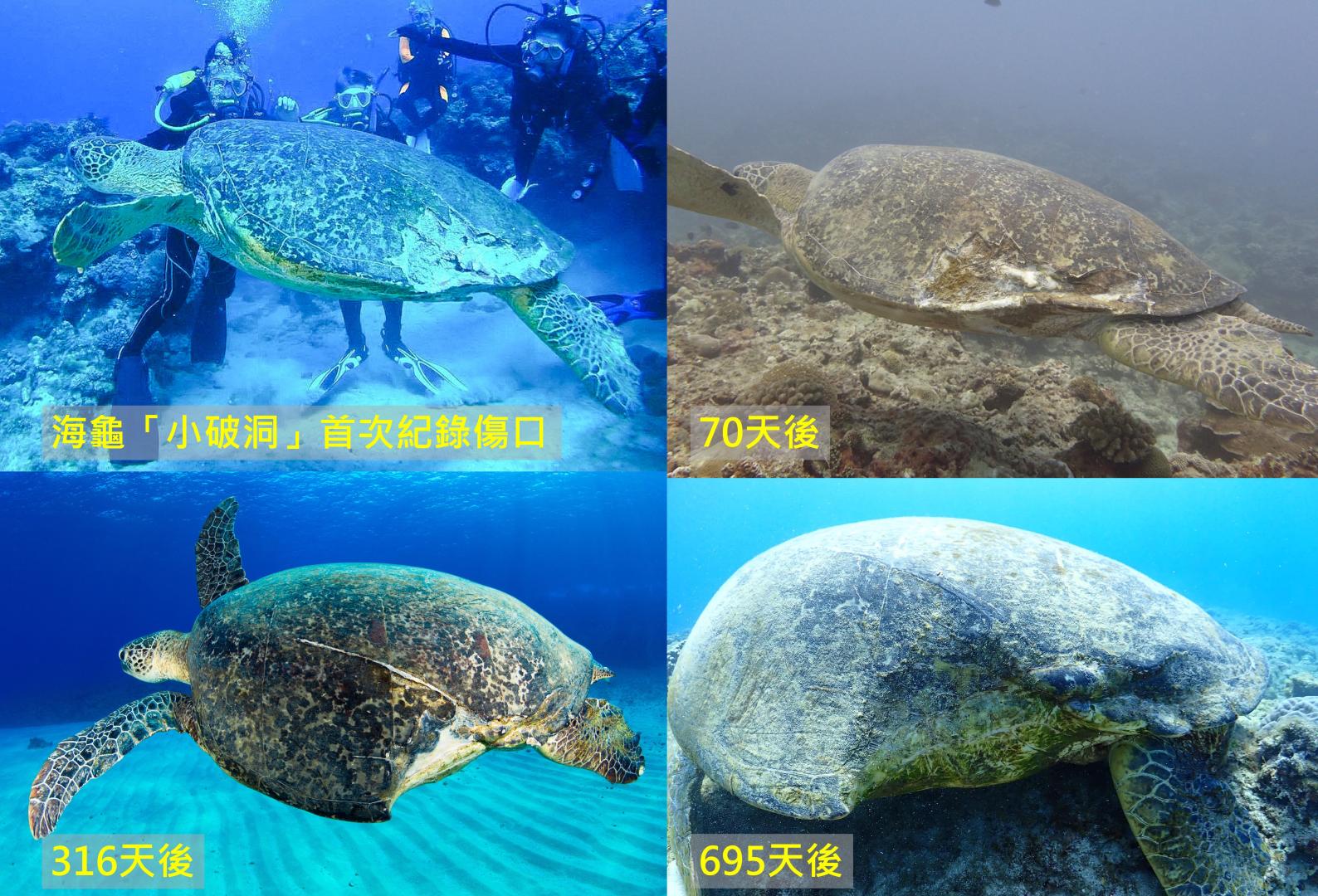 海龜受傷後平均需要約500-600天才能完全復原。像這隻被暱稱「小破洞」的海龜,被船隻螺旋槳打傷後,有民眾陸續記錄到牠恢復的狀況。影像提供/海龜點點名
