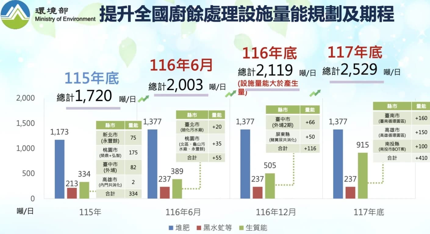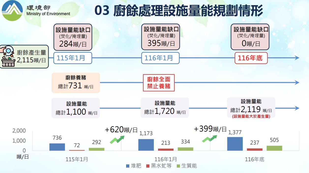 環境部規劃三年後的廚餘處理設施量能。資料來源/環境部